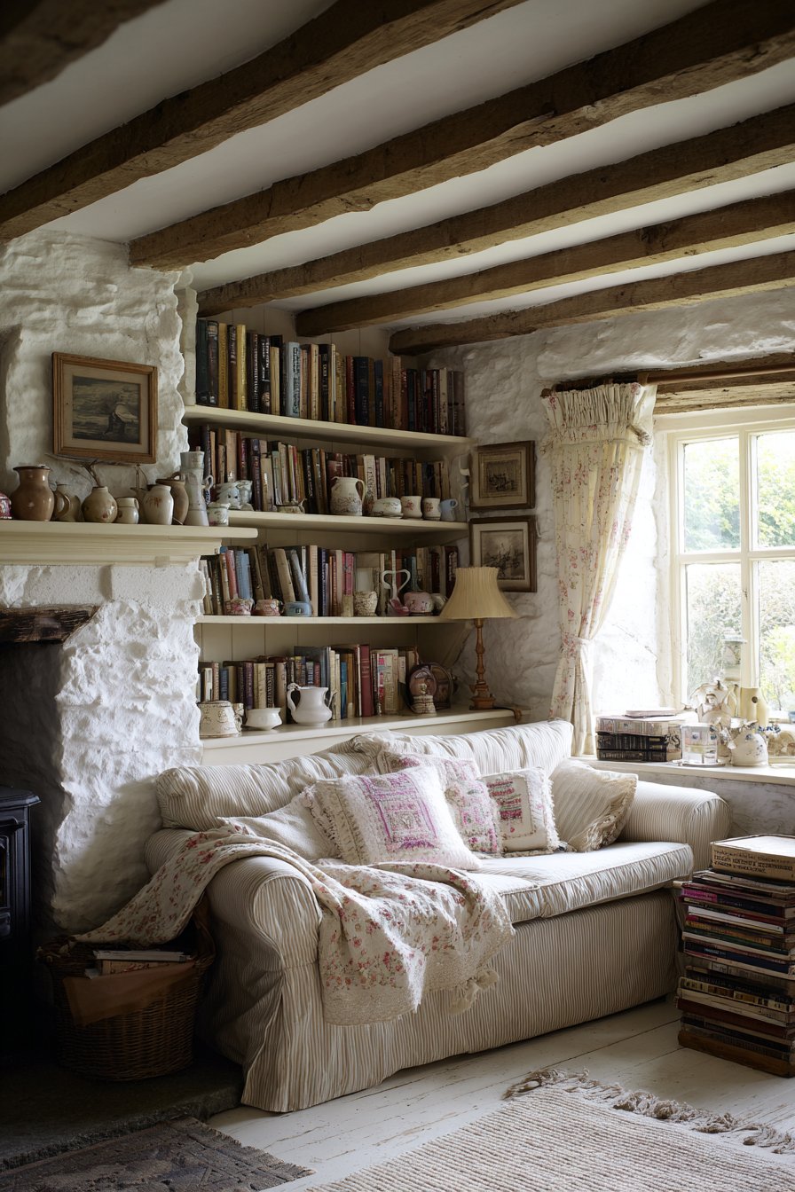 Exposed wooden ceiling beams in natural oak finish create dramatic architectural interest overhead. These structural elements define the cottage aesthetic immediately upon entering the space. Built-in bookshelves flank a small working fireplace, painted in soft cream. Open shelving displays pottery collections and vintage books with worn spines. The arrangement feels curated yet casual, personal yet welcoming.