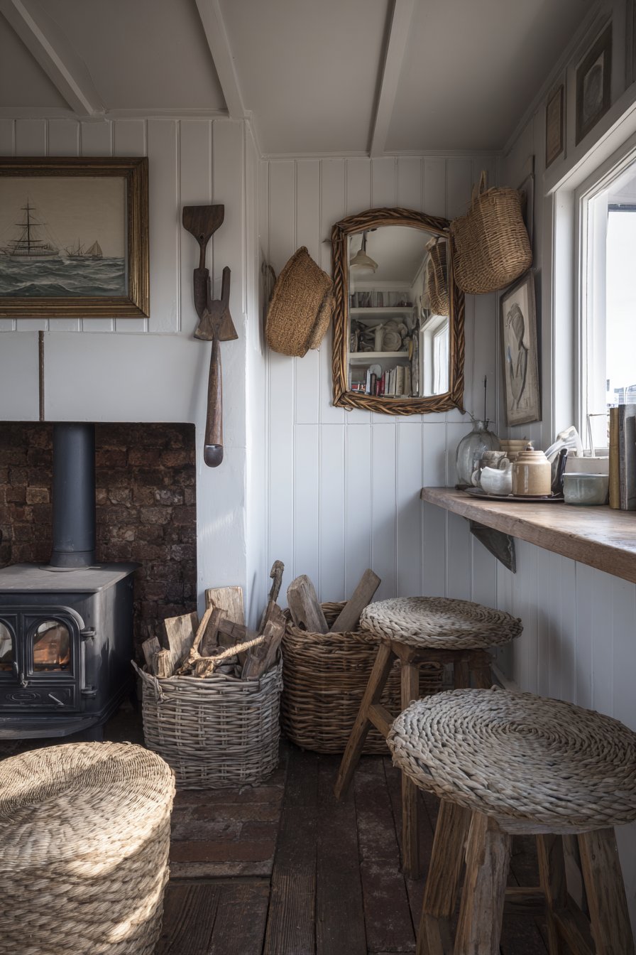Wood stoves provide efficient heating while creating atmospheric focal points. The cast iron develops beautiful patina over years of use. Slate hearths offer fire protection with natural stone beauty. Willow baskets represent traditional cottage crafts that remain both beautiful and functional.