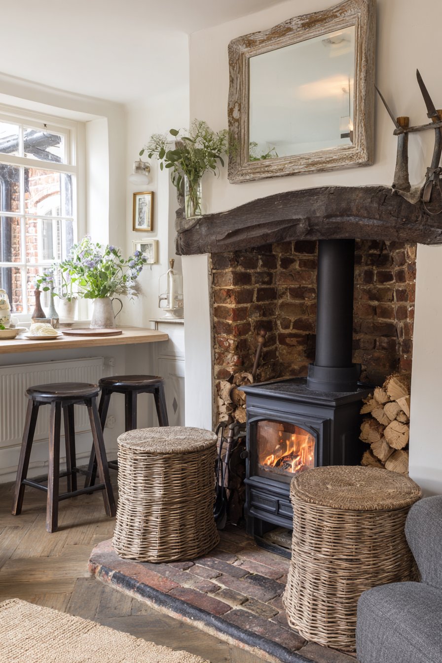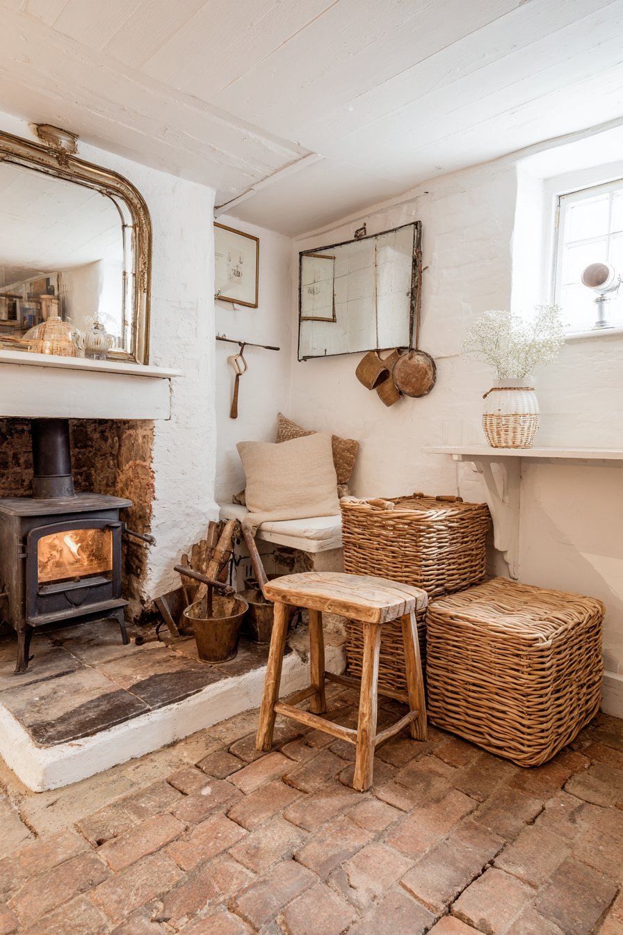 A cast iron wood stove positioned on original brick flooring creates practical cottage heating. Vintage fire tools with wooden handles show natural patina from years of use. Log storage in woven willow baskets flanks the stove. The adjacent wall displays a vintage mirror with distressed gilt frame. The mirror reflects firelight, amplifying warmth and light throughout the room.