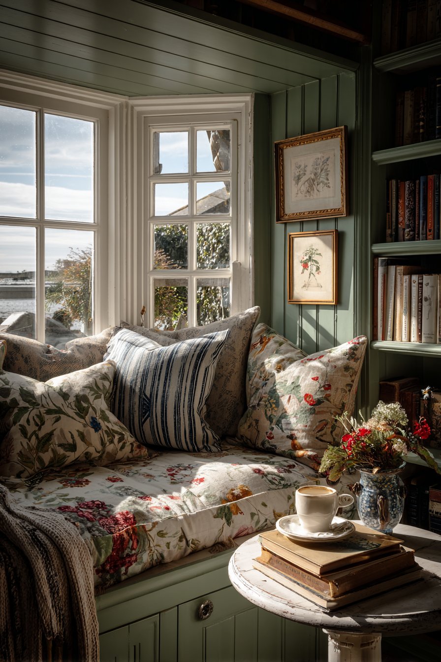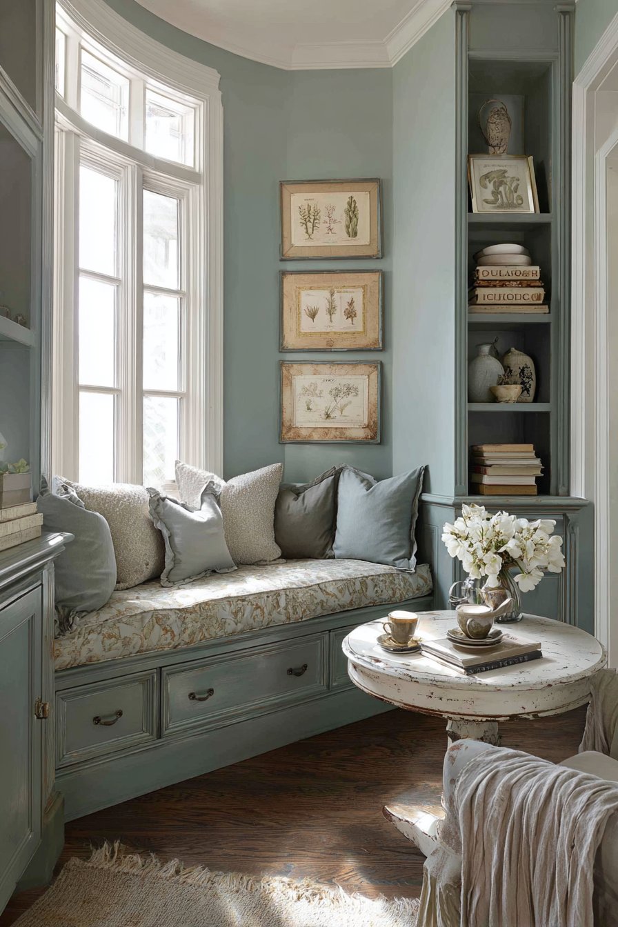 - Paint built-in bookcases in soft sage green for calm cottage reading spaces