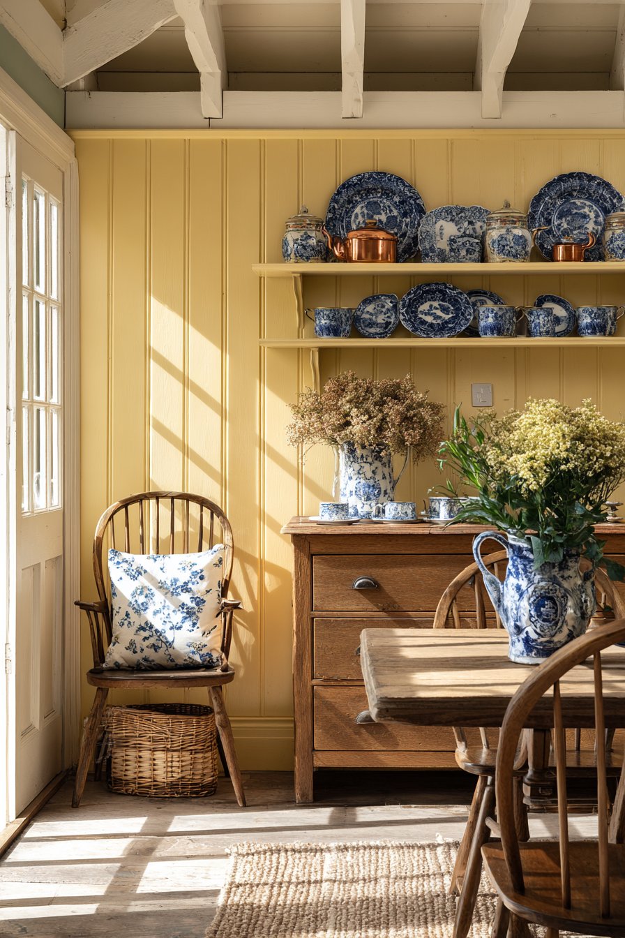 Tongue-and-groove paneling painted in warm buttermilk yellow creates a cheerful backdrop for cottage collections. The color brings sunshine into the room even on cloudy days. A vintage Welsh dresser becomes the statement piece, displaying blue and white transferware china collections. Copper kettles with natural patina add warm metallic accents. The aged copper contrasts beautifully against the blue ceramics.