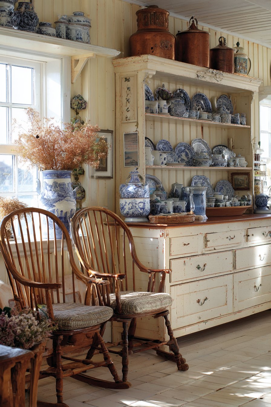 Blue and white ceramics represent cottage collecting traditions spanning centuries. Transferware patterns often depicted pastoral or Asian-inspired scenes. Willow pattern remains the most recognized and collected design. Mixing patterns creates visual interest while maintaining color cohesion.
