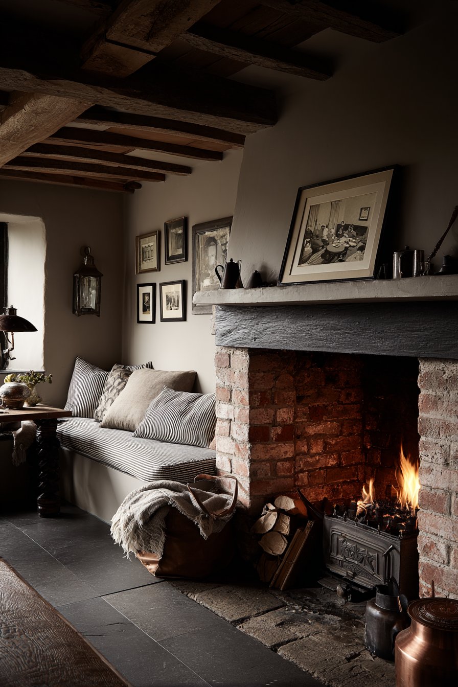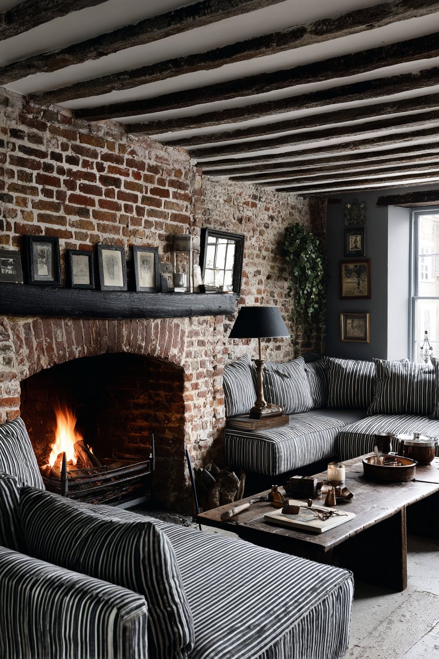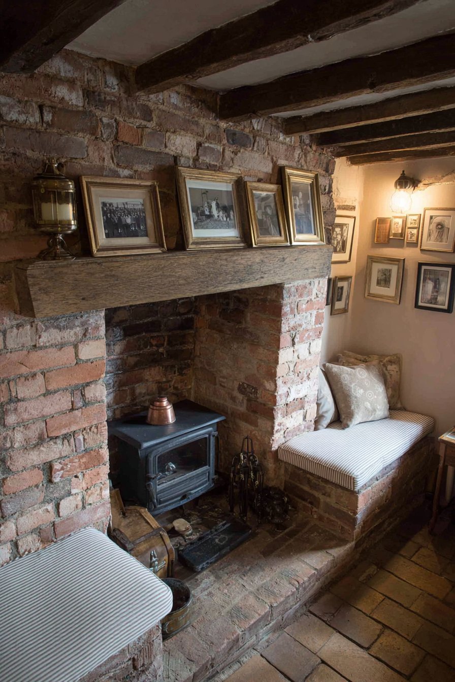 The inglenook fireplace represents cottage architecture at its most charming and functional. Original brick surround and cast iron grate create authentic period character. Built-in bench seating flanks the hearth, featuring thin cushions in ticking stripe fabric. The arrangement creates an intimate gathering spot around the fire. Low exposed ceiling beams frame this cozy space within the larger room.