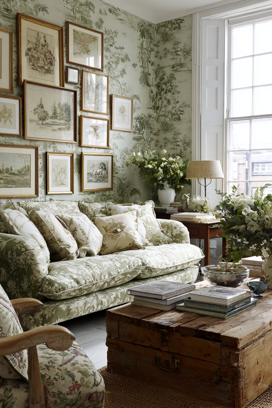 A statement feature wall covered in vintage wallpaper depicts pastoral toile scenes in soft sage and cream. The detailed pattern creates visual interest without overwhelming the cottage space. A camelback sofa in faded floral chintz faces a chunky coffee table. The table crafts from reclaimed barn wood with visible mortise joints and natural edge details.