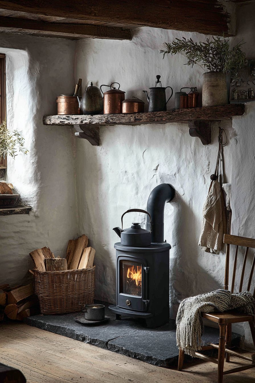 A compact wood-burning stove in matte black cast iron sits on a slate hearth. This practical heating solution suits cottage living perfectly. Log storage baskets woven from willow flank the stove, combining function with natural texture. The adjacent wall displays a rustic floating shelf made from reclaimed timber. Copper pots and vintage enamelware sit on the shelf, adding utility and beauty.