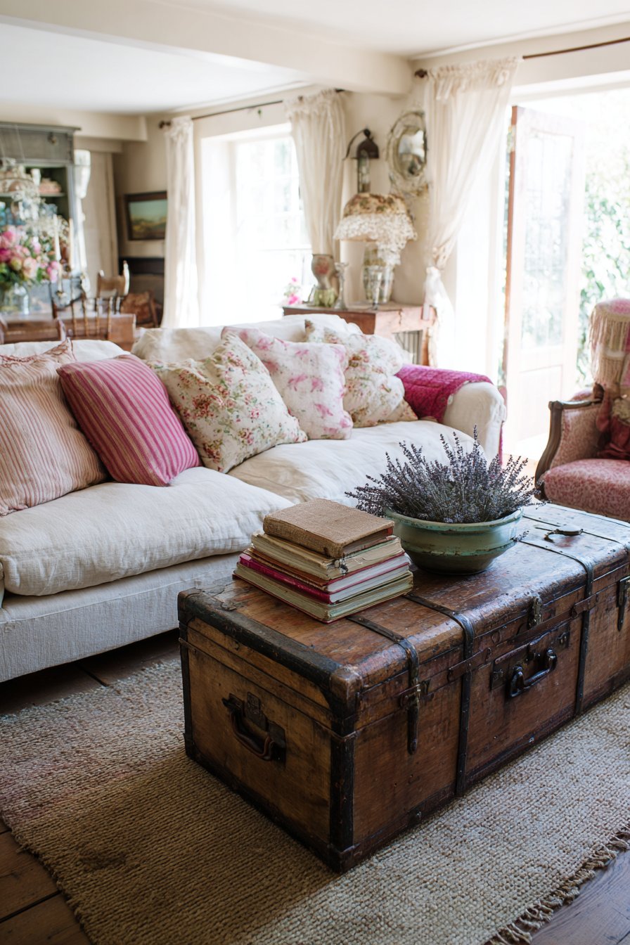 Antique trunks provide storage while serving as unique coffee tables. The leather bindings and brass hardware add beautiful details. Dried lavender represents traditional cottage practices of bringing garden herbs indoors. The fragrance creates sensory cottage appeal beyond visual design.