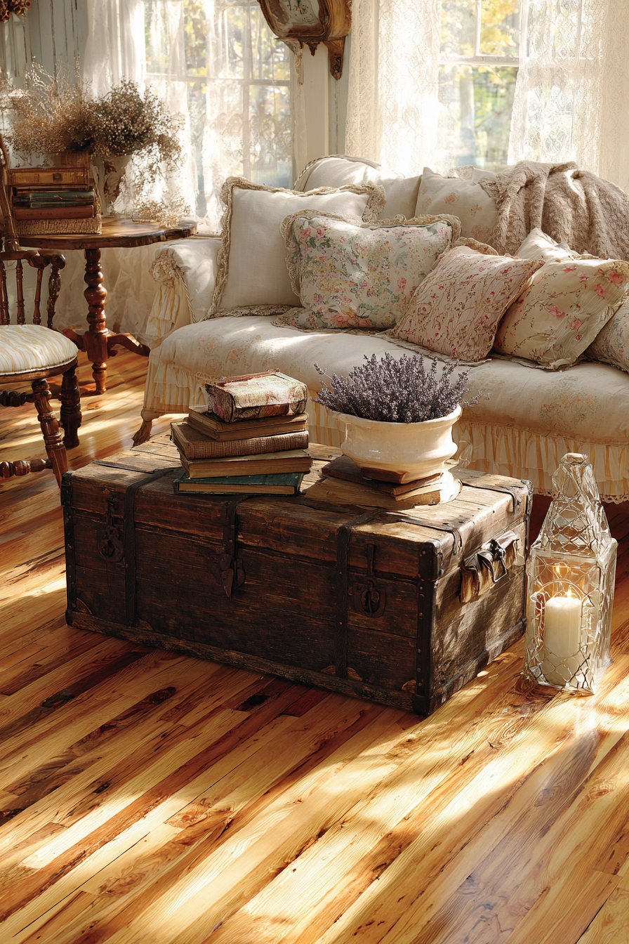 - Repurpose antique trunks as coffee tables for storage and cottage character