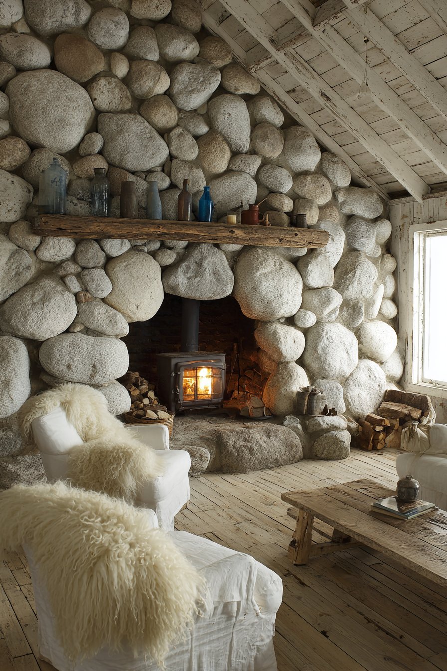 Fieldstone walls represent vernacular cottage architecture using local materials. The irregular shapes create organic patterns that manufactured materials cannot replicate. White mortar joints highlight individual stone shapes and colors. Pine mantels suit cottage aesthetics with their natural wood grain and warm tones.