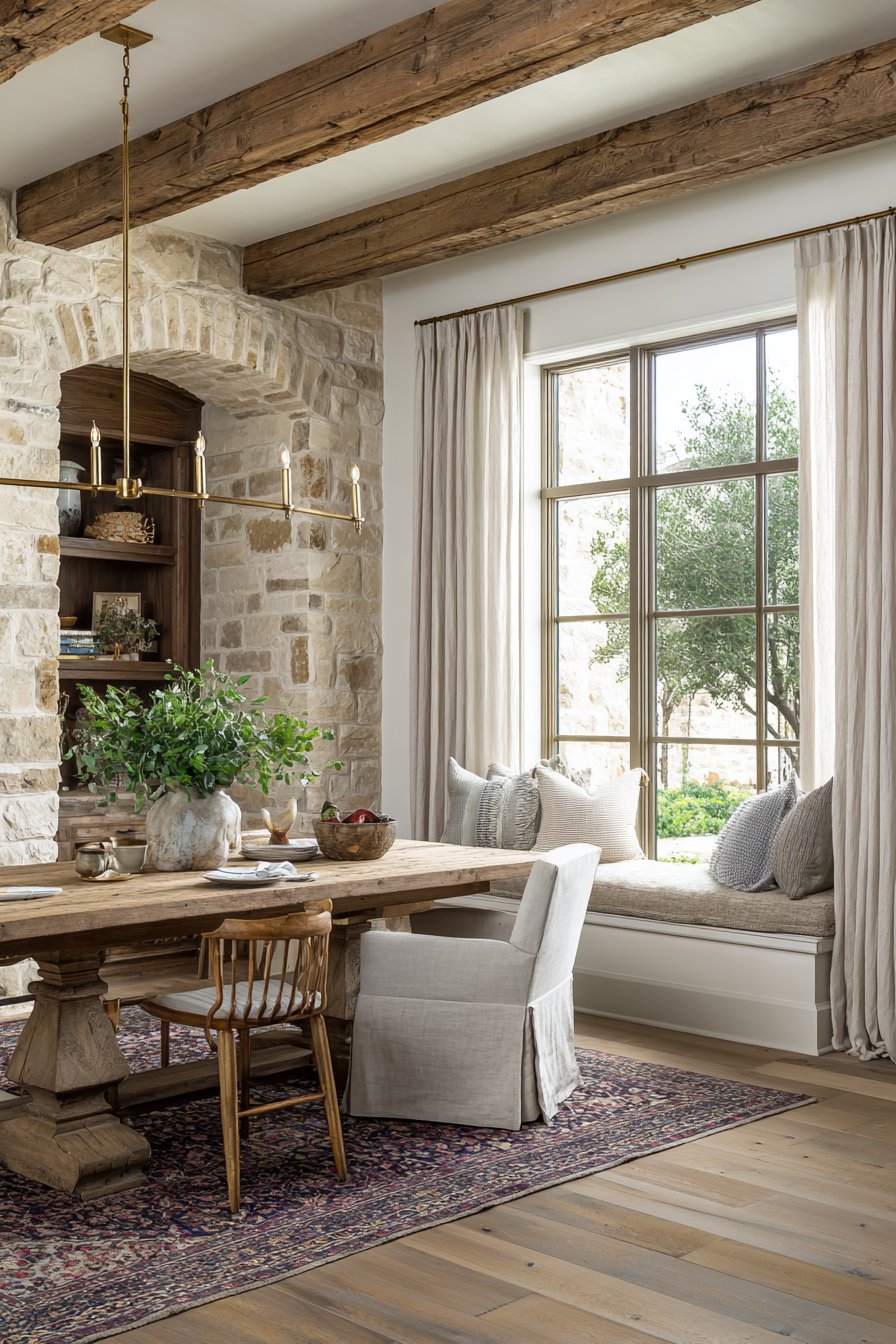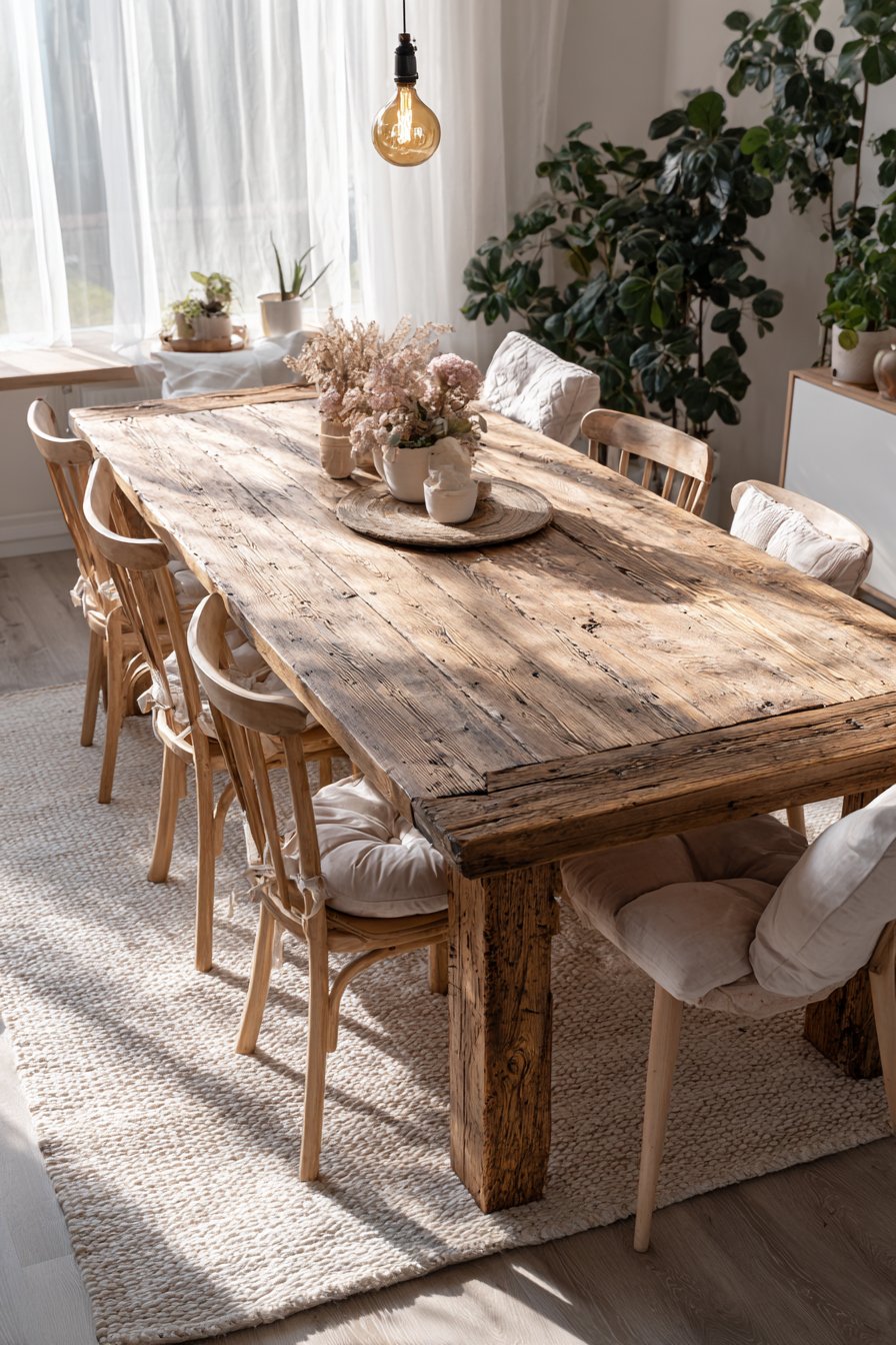 The textured area rug anchors the entire dining zone beneath the table. Natural morning light filters through sheer curtains with gentle grace. Soft shadows dance across the weathered wood surface throughout the day. The layered textures create depth and visual warmth in the space.