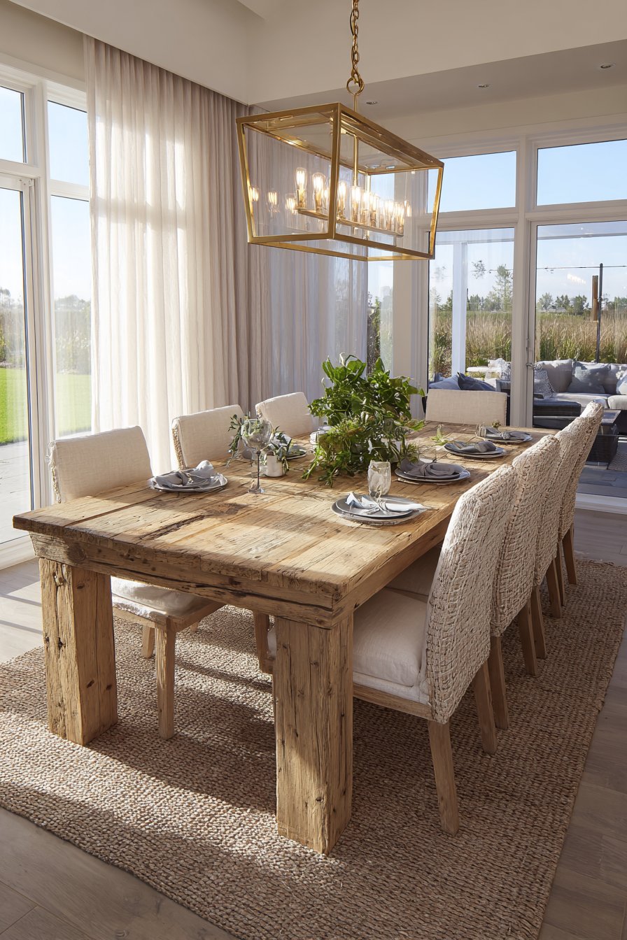 A reclaimed barn wood trestle table showcases visible mortise and tenon joinery. This traditional construction method adds architectural interest and structural integrity. The authentic material tells stories through nail holes and weathering patterns. Mixed seating includes leather dining chairs and an upholstered linen bench.