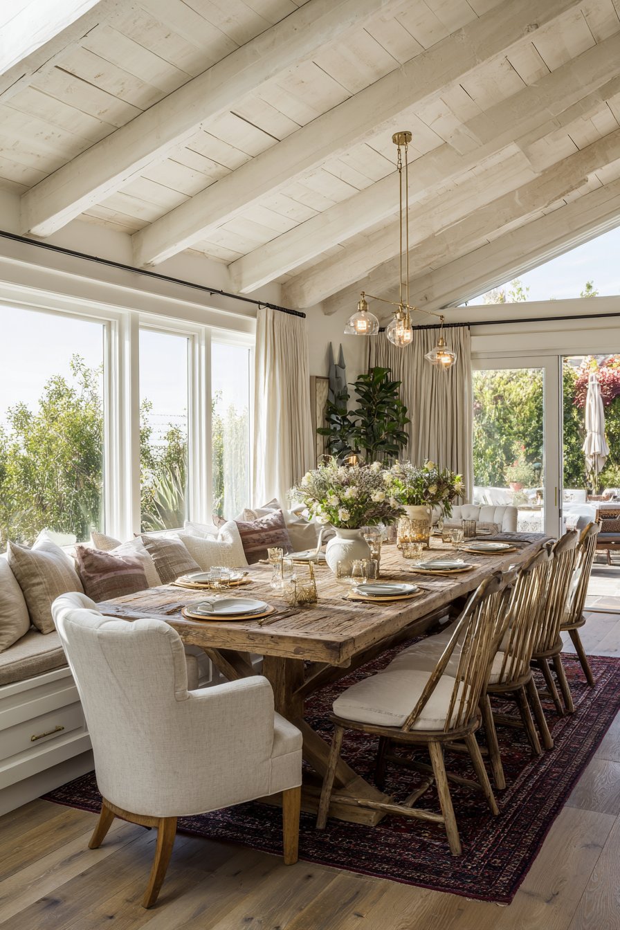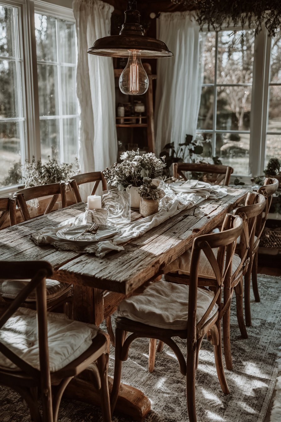 Mismatched vintage chairs surround the table with eclectic charm. Linen cushions in warm cream tones soften the wooden seats. Each chair brings its own personality to the arrangement. The combination creates visual interest while maintaining cohesive comfort. Above, a low-hanging brass pendant light features Edison bulbs that cast intimate illumination.