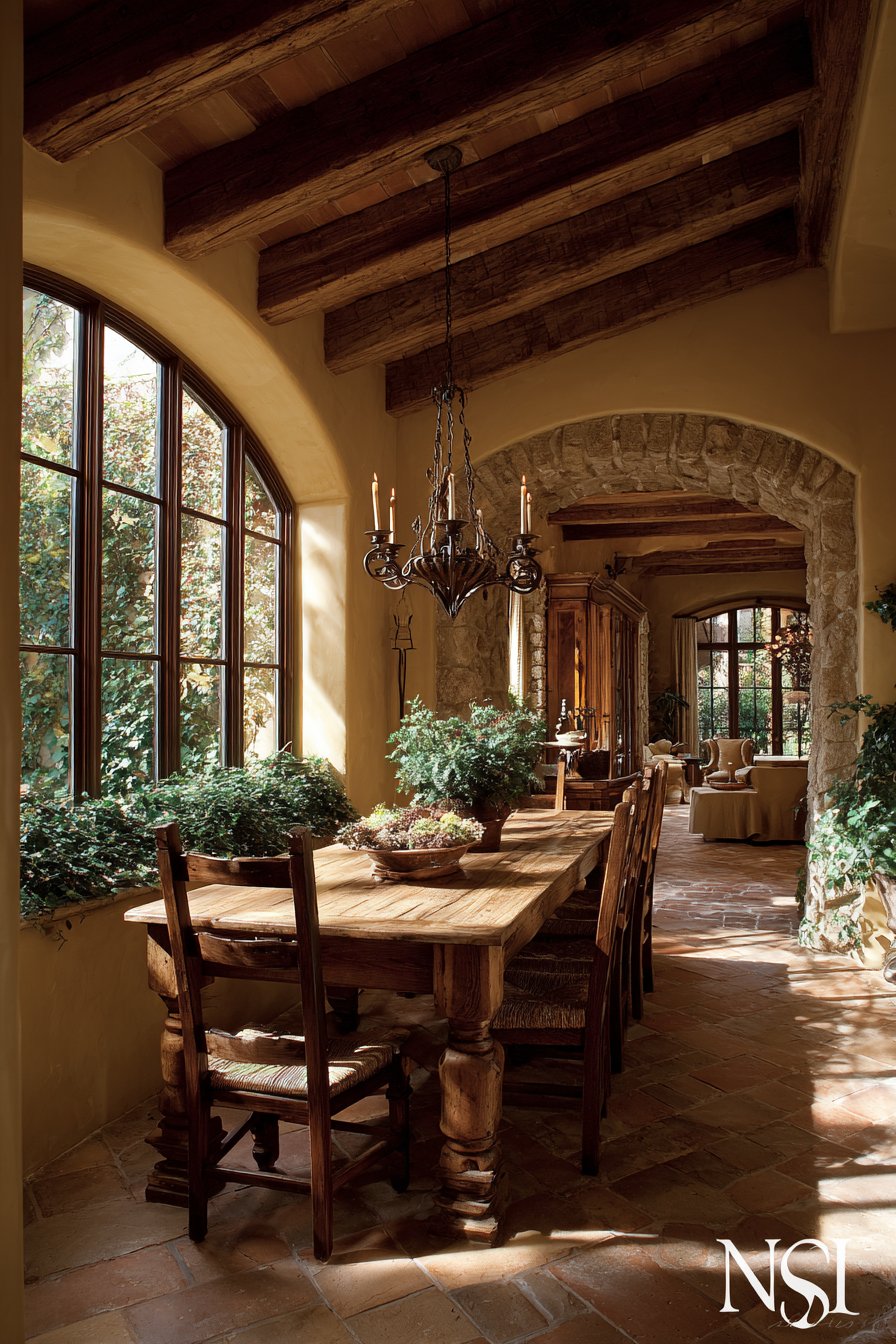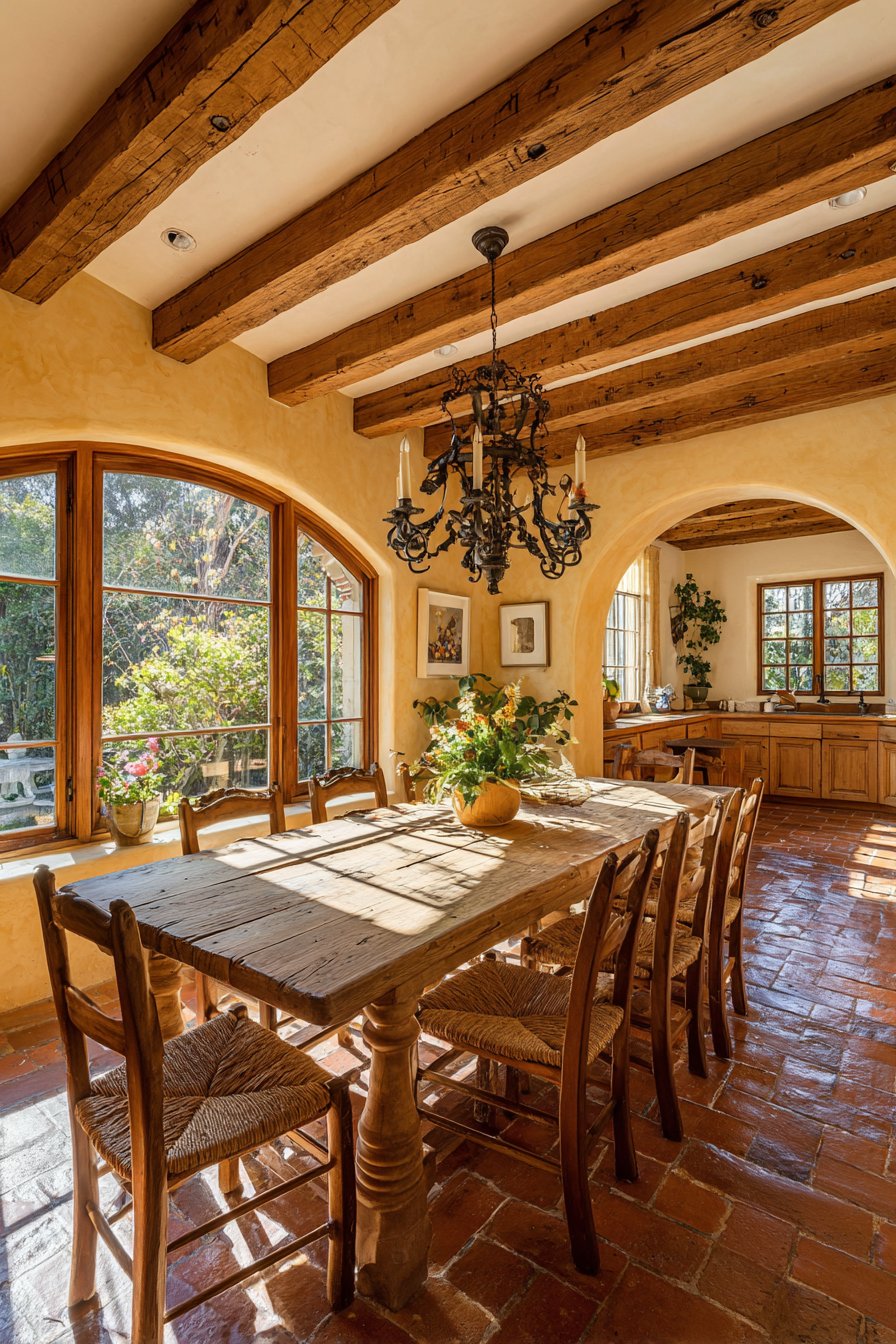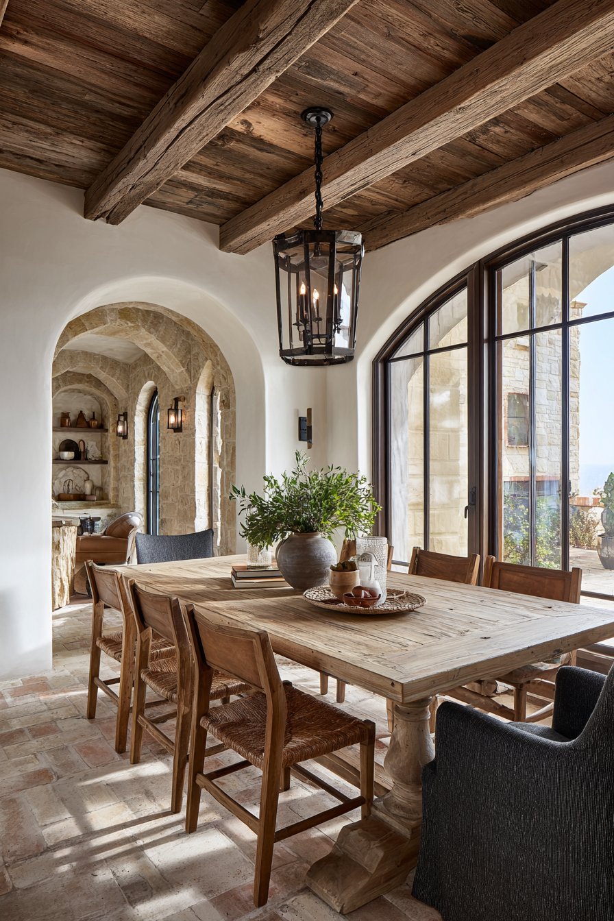 Terra cotta tile flooring grounds the Mediterranean-inspired space with earthy beauty. Natural light through arched windows highlights the warm material palette beautifully. The sun-drenched atmosphere evokes European countryside dining experiences. Shadow play across textured surfaces adds depth and visual interest throughout the day.