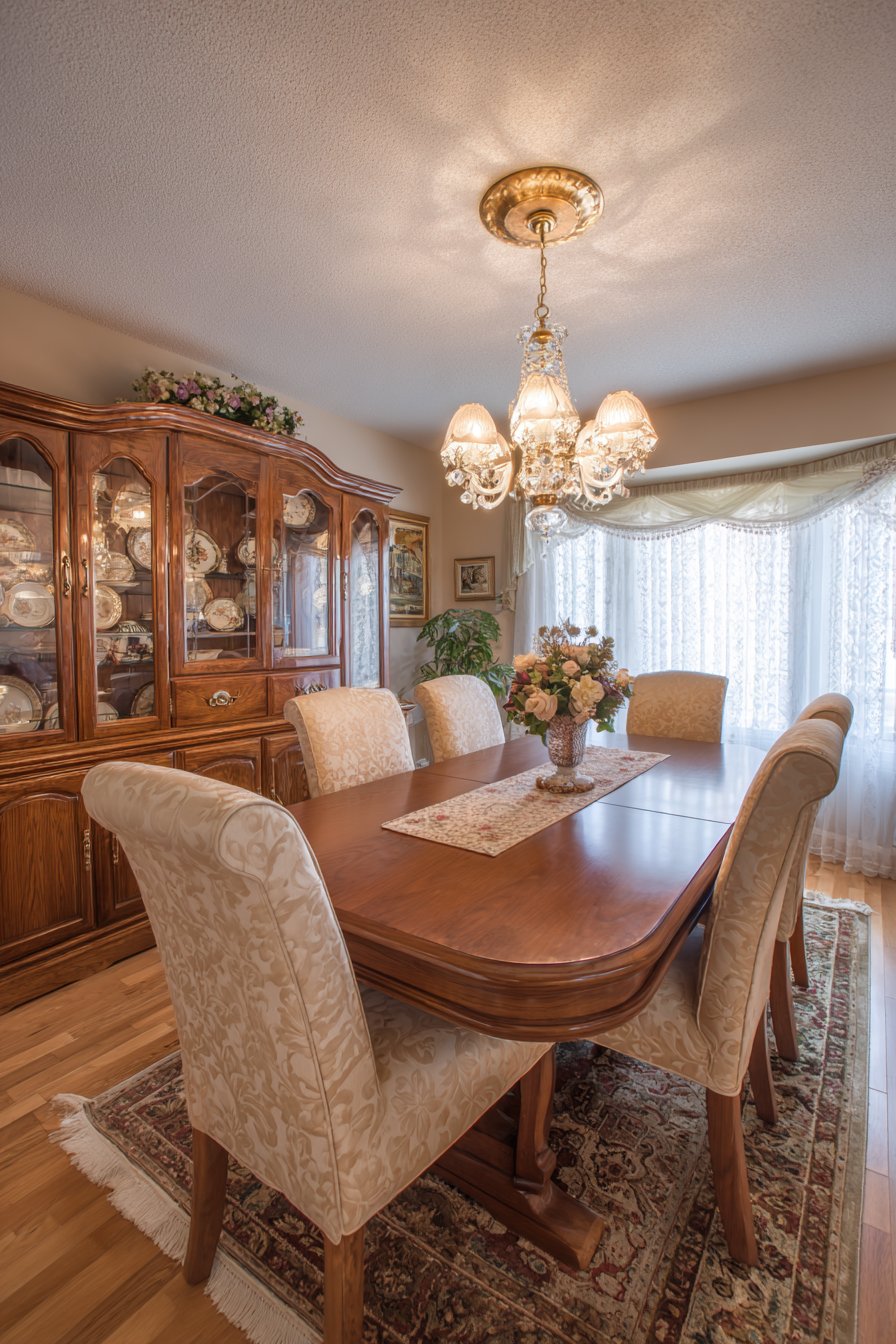 This design achieves approachable elegance through carefully curated vintage pieces. The brass chandelier adds warmth without feeling overly formal. Natural elements like flowers and linen connect the refined aesthetic to nature. The result feels collected rather than decorated, lived-in rather than staged.