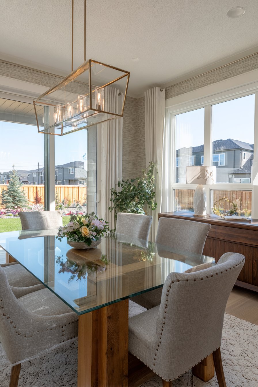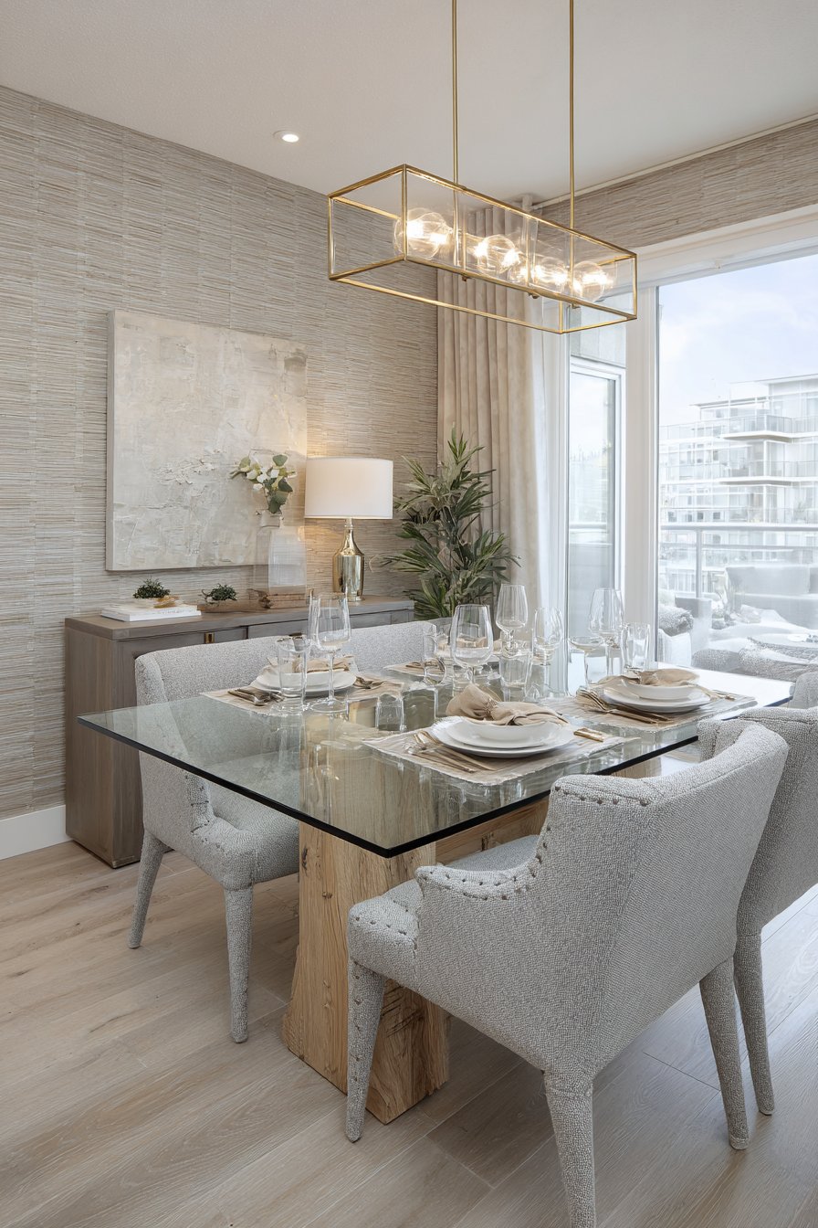Neutral grasscloth wallcovering adds subtle texture without competing for attention. A modern sideboard in walnut provides essential storage along the wall. Natural window light interacts beautifully with the transparent table surface. This creates layered depth and visual complexity in the transitional space.