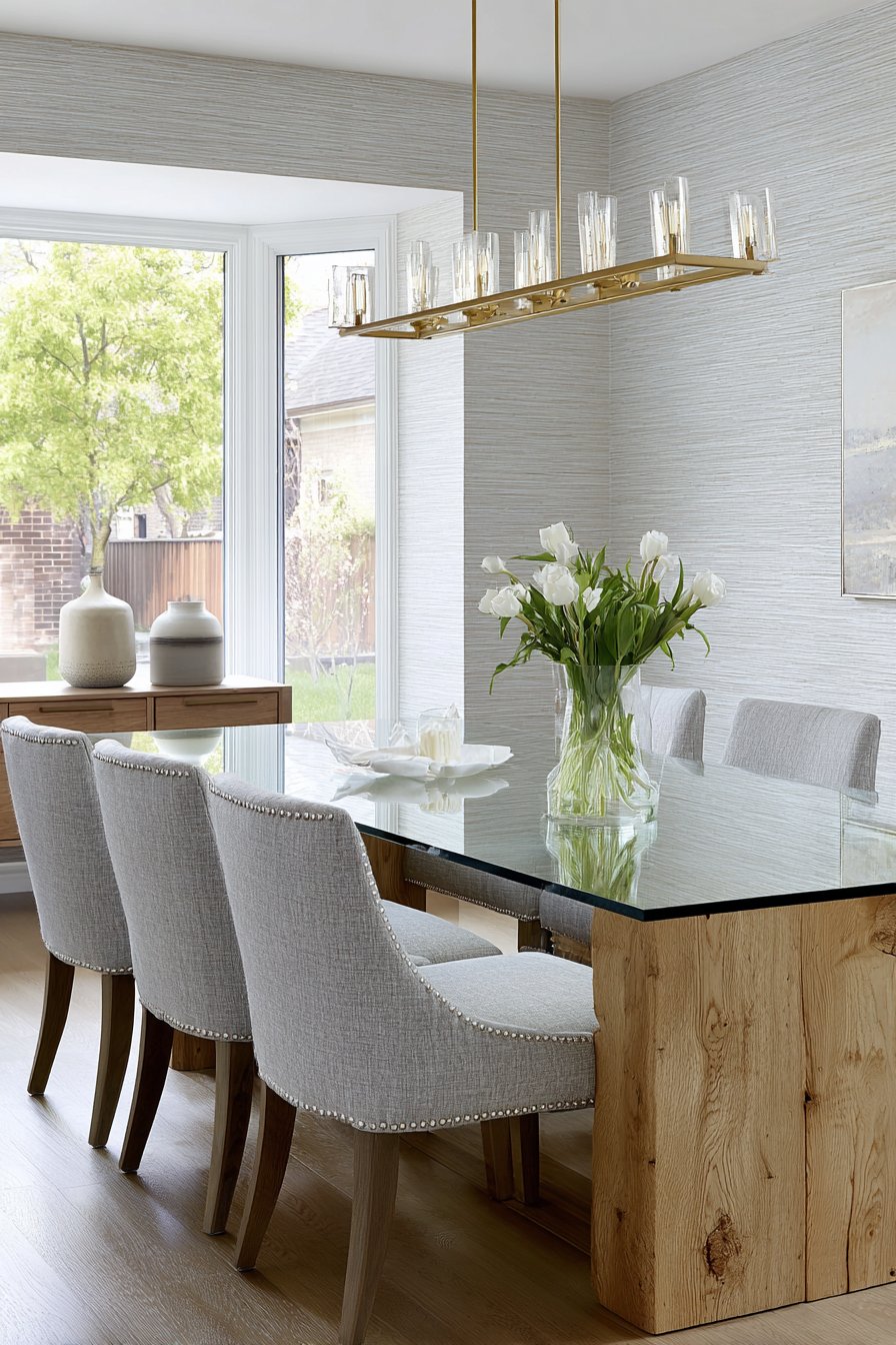 A rectangular glass-top table supported by a chunky wooden base in natural oak creates visual interest. Modern upholstered dining chairs in soft grey linen with nailhead trim provide comfortable seating. The transparent table surface creates spatial lightness in the room. A linear chandelier with a geometric brass frame and frosted glass shades hangs above.
