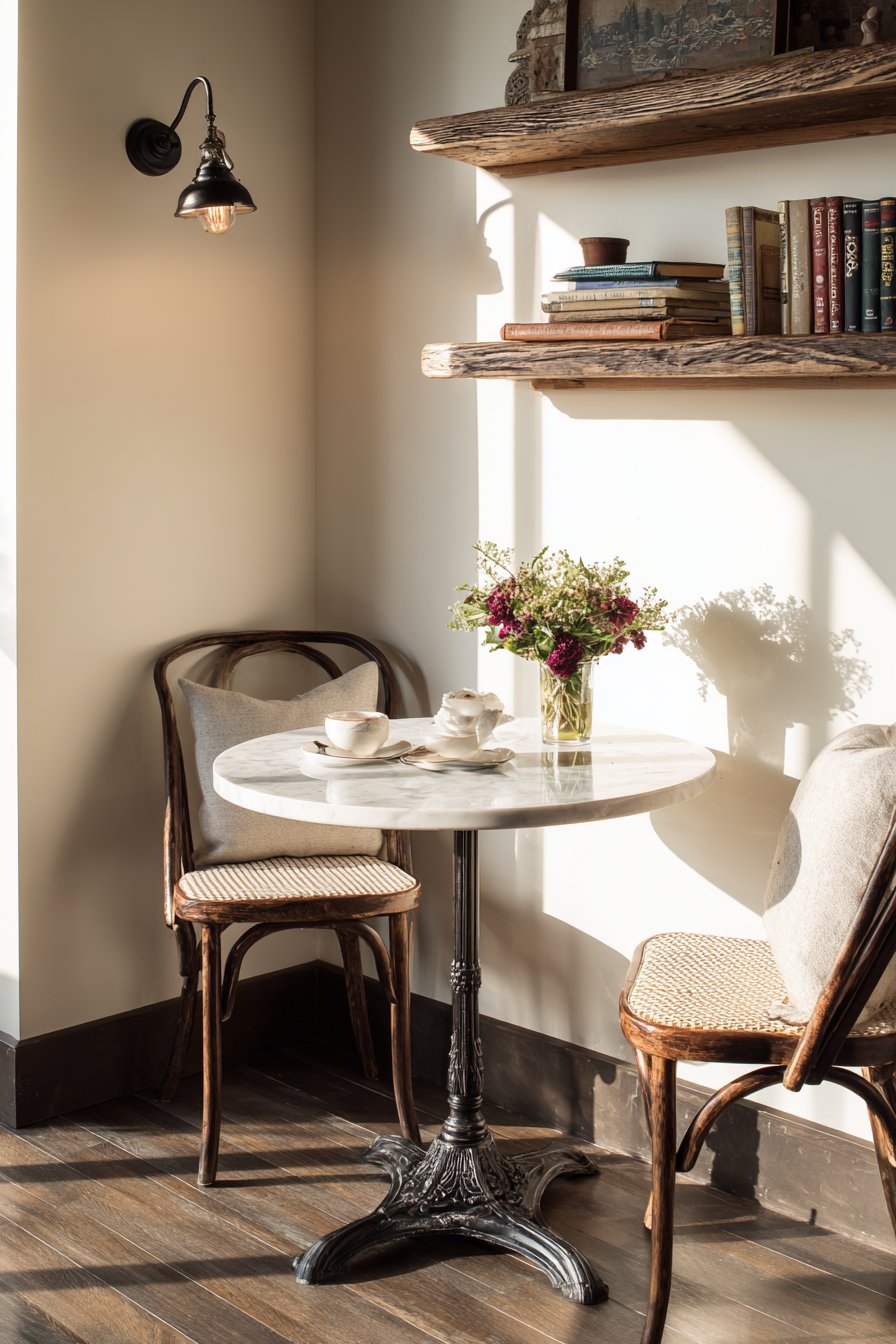 A small bistro-style round table with cast iron pedestal base and marble top creates café charm. Two bentwood chairs with cane seats and cushions provide comfortable seating. This intimate arrangement works perfectly for couples or small apartments. A vintage-inspired wall sconce with an adjustable arm provides task lighting.