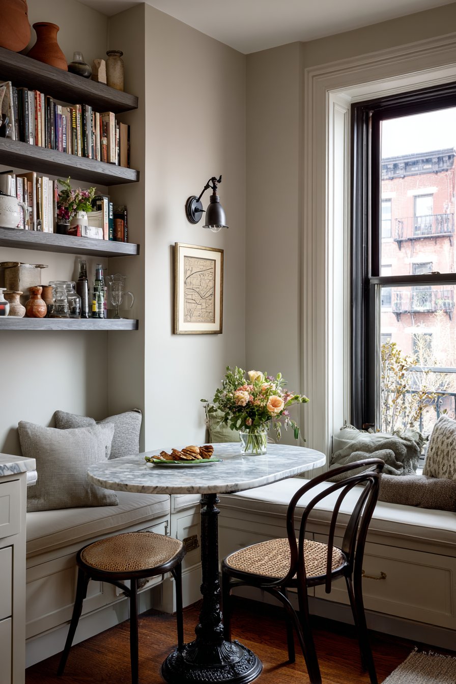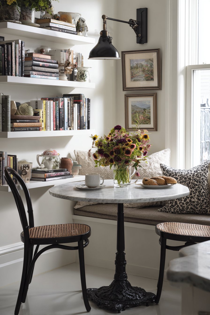 Open shelving holds cookbooks and decorative pottery with accessible display. A small vase with fresh market flowers sits on the marble surface. Afternoon light from a nearby window creates an intimate café-like atmosphere. This design proves that dining spaces need not be large to be inviting.