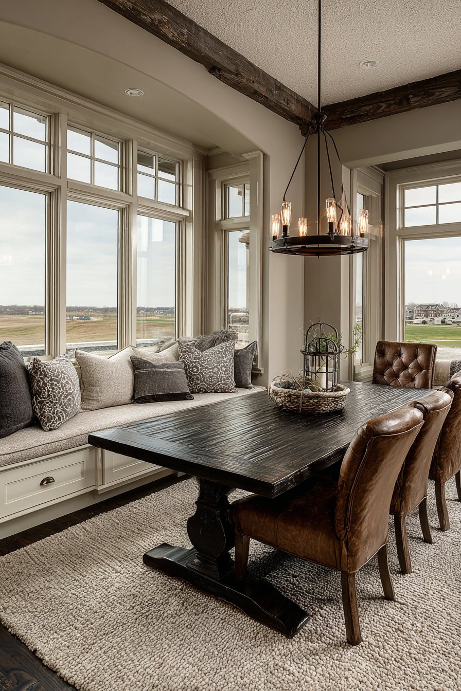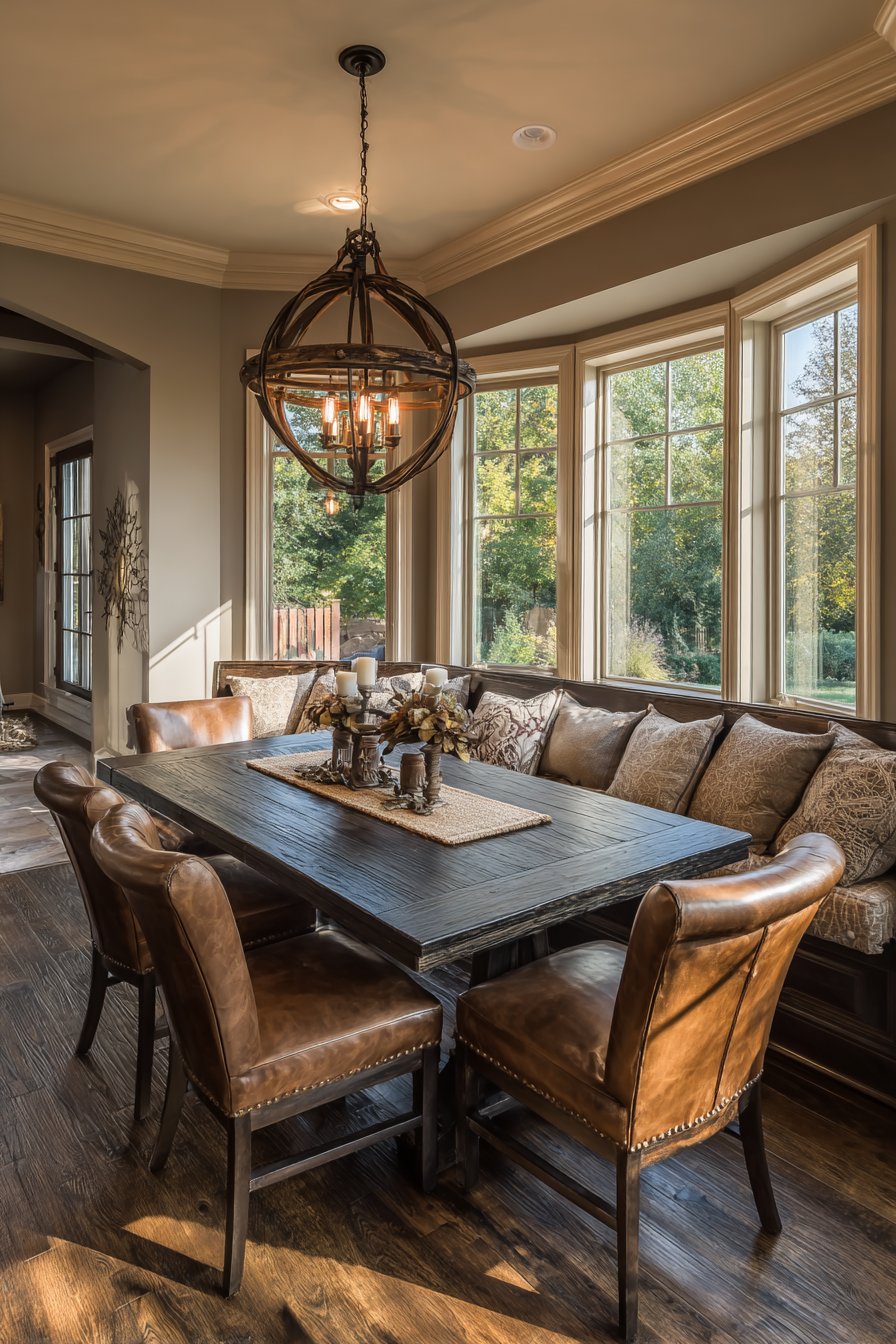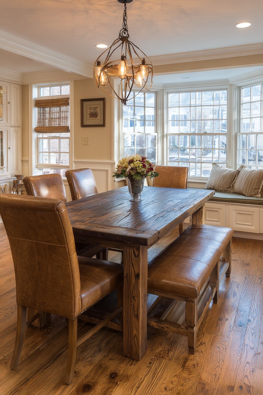 Built-in window seat with storage and cushions offers additional flexible seating. The rich wood tones create traditional warmth throughout the space. Natural light emphasizes the beautiful wood grain and leather patina. This design balances tradition with practical modern functionality.