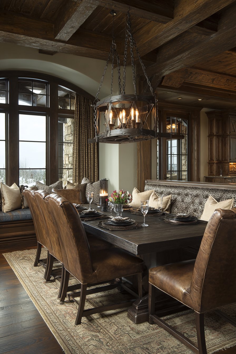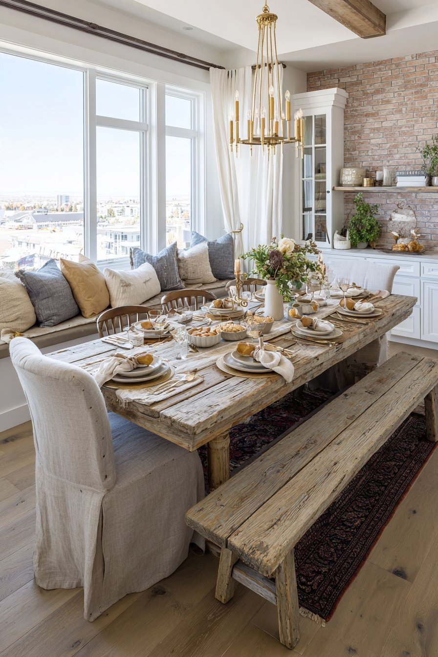 Natural side lighting emphasizes the authentic material patina throughout the day. The leather chairs develop character and soften with age and use. The oatmeal linen bench provides flexible seating for larger gatherings. This design successfully merges rustic warmth with industrial edge.