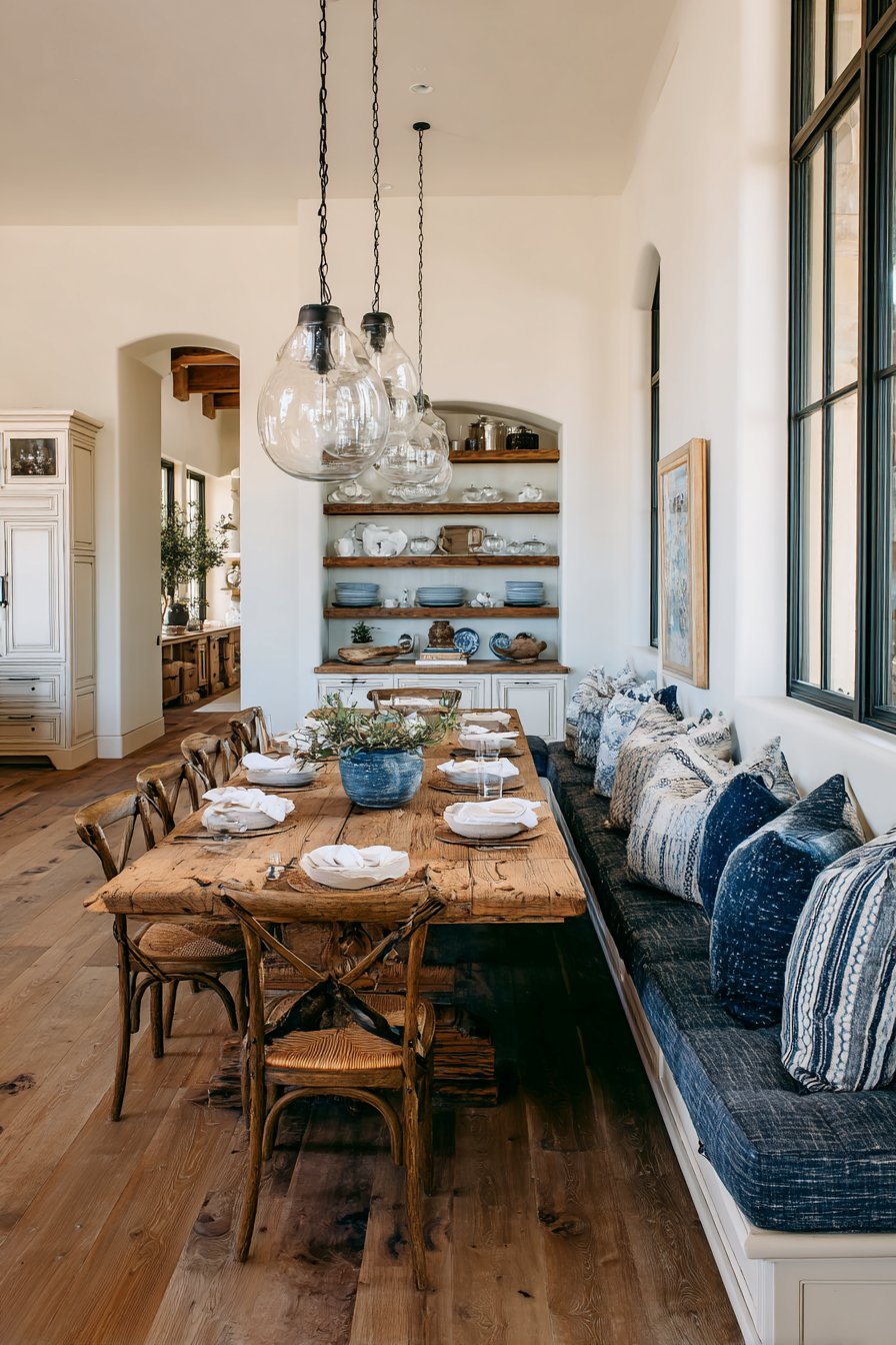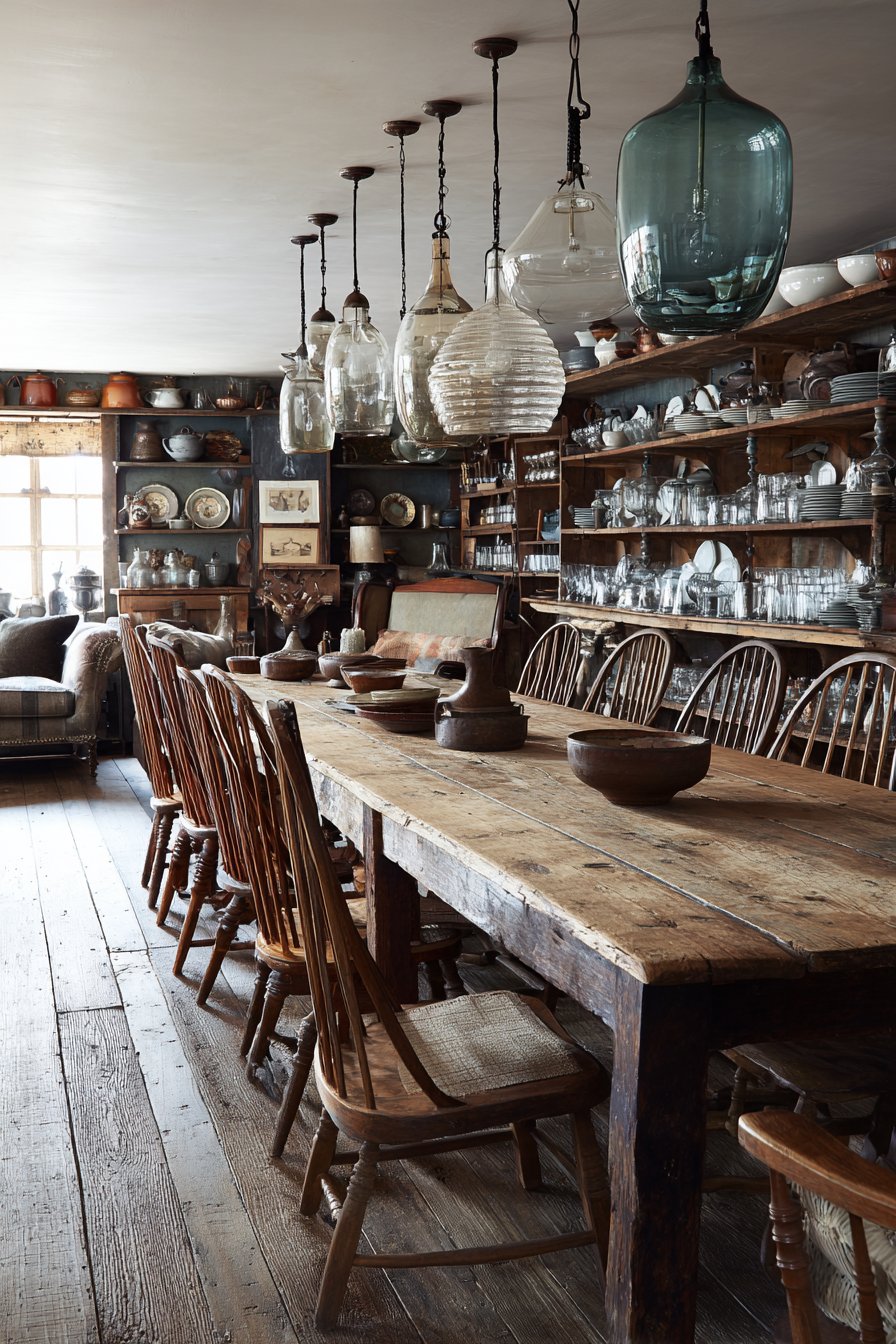 A weathered pine farm table with natural knots and grain variation serves as the centerpiece. Wooden Windsor chairs and an upholstered settee in faded indigo linen provide mixed seating. A collection of vintage glass pendant lights in varying sizes hangs at different heights. Open shelving displays ironstone dishes and vintage glassware with casual arrangement.