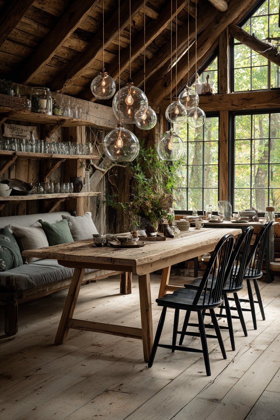 The weathered pine finish celebrates natural aging and authentic wear. Mixed seating types add visual interest and accommodate different preferences. Clustered pendant lights at varied heights create dynamic overhead illumination. Open shelving allows everyday items to serve as decoration.