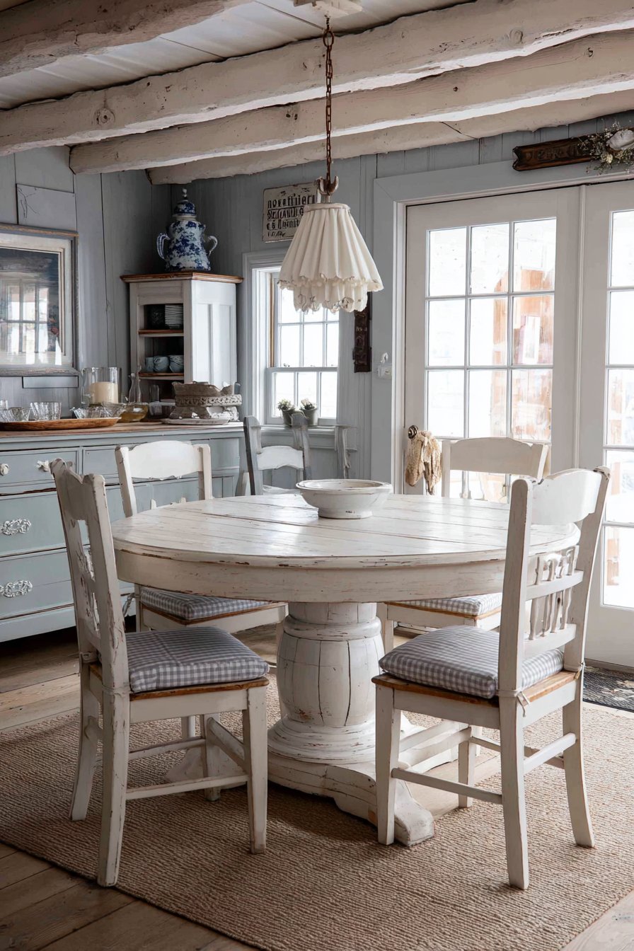 The distressed white finish suggests years of loving use and care. Gingham cushions introduce pattern in traditional, non-threatening ways. The linen chandelier provides softness overhead without excessive decoration. Pale blue-grey walls create calm without coldness.