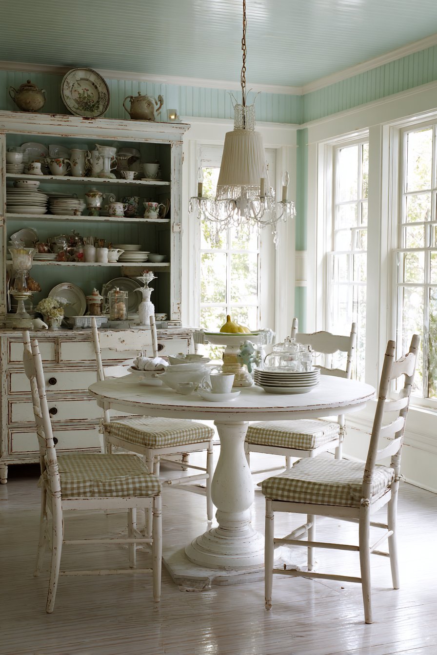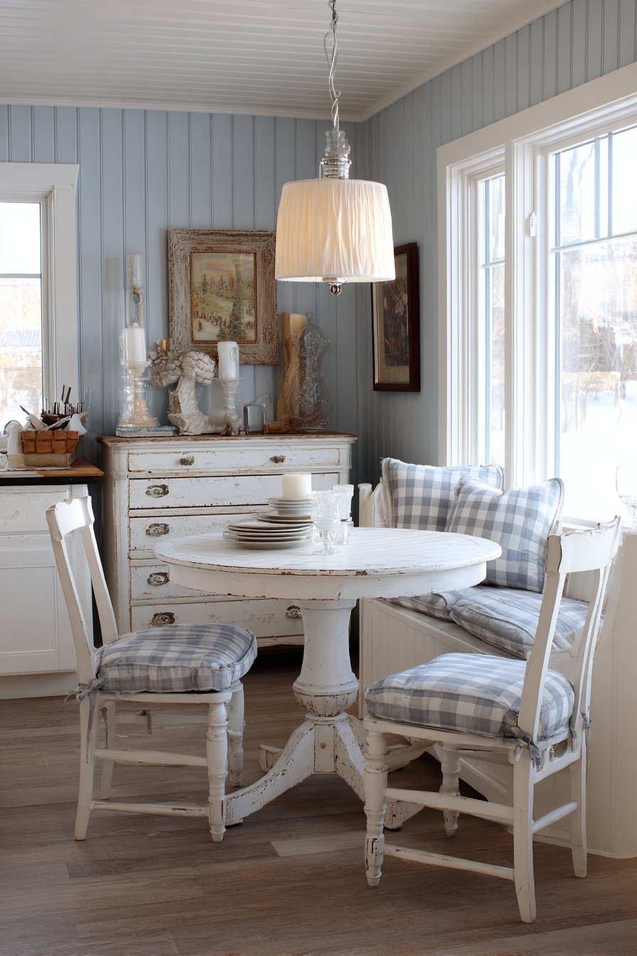 A painted white pedestal table with gentle distressing reveals wood beneath the finish. Ladder-back chairs with gingham cushions provide cheerful, comfortable seating. A simple linen chandelier with pleated shade creates soft ambient light. Beadboard walls painted in pale blue-grey add classic cottage charm.
