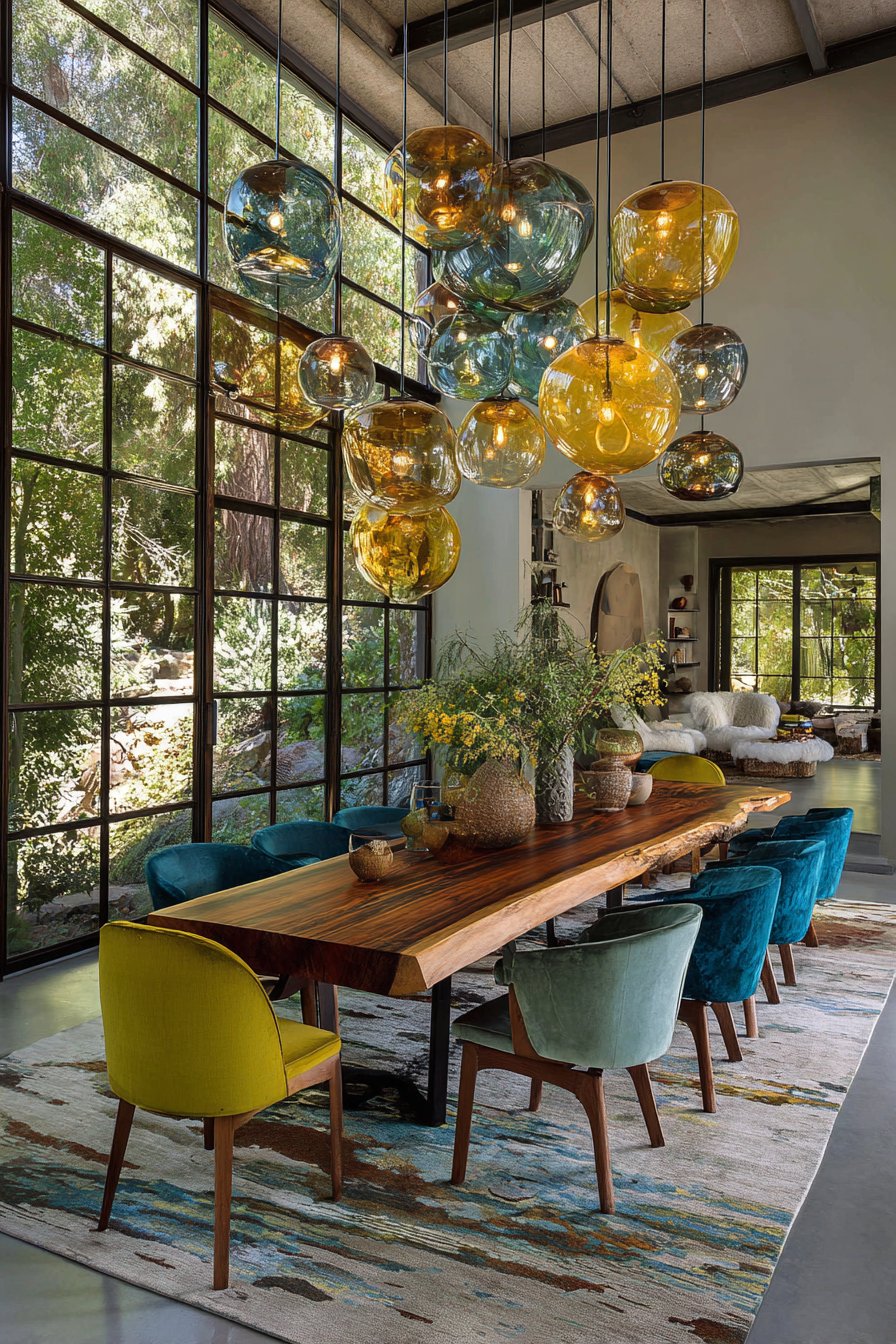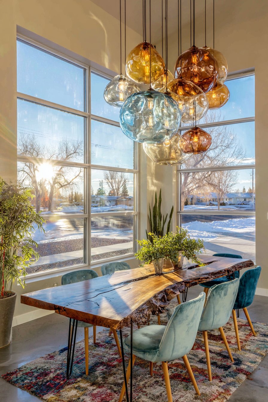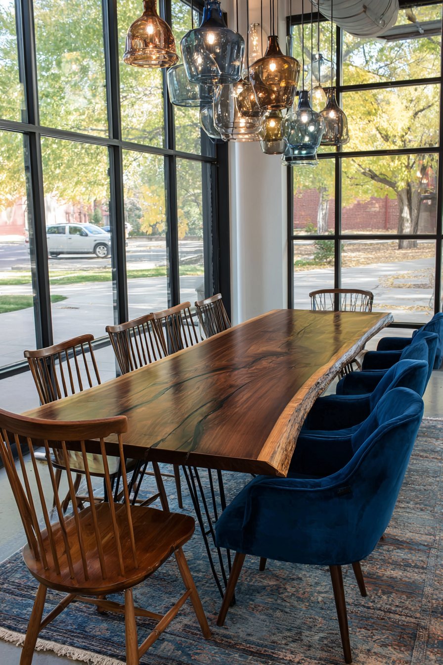 A live-edge black walnut slab table with natural imperfections creates dramatic impact. Modern steel hairpin legs provide industrial contrast to the organic top. Mixed seating includes mid-century modern chairs in teal velvet and natural wood spindle-back chairs. A cluster of hand-blown glass pendant lights in amber and smoke tones hangs overhead.