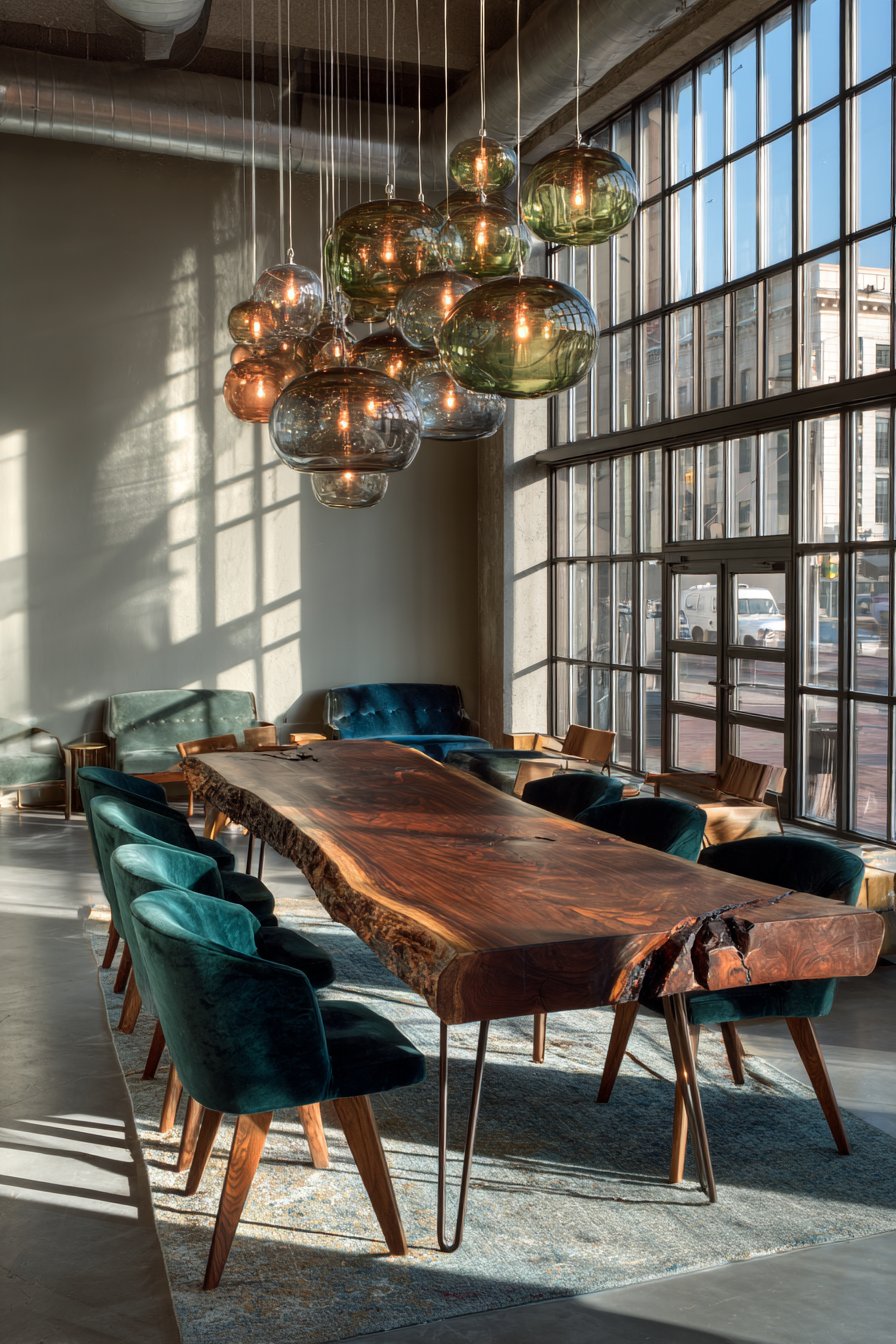 The black walnut slab showcases dramatic grain patterns and natural edges. Hairpin legs add mid-century modern sensibility without competing with the top. Teal velvet introduces unexpected color in sophisticated ways. Hand-blown glass pendants serve as functional sculpture above the table.