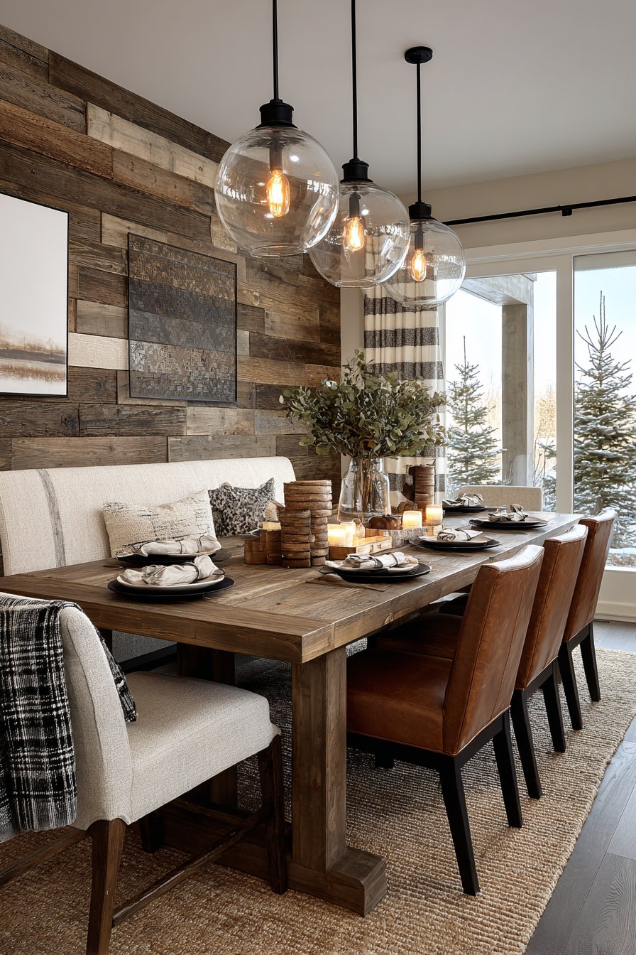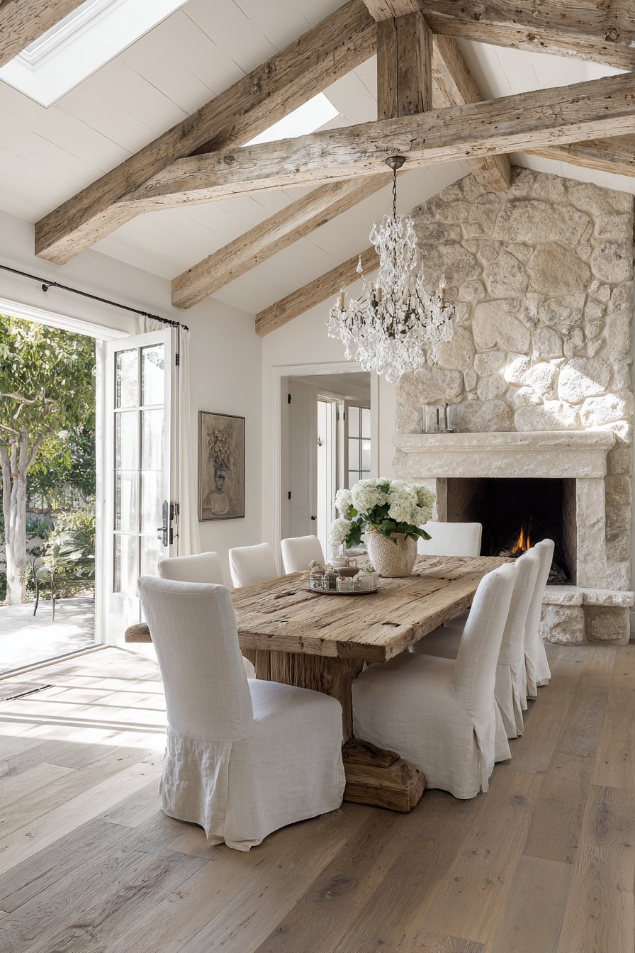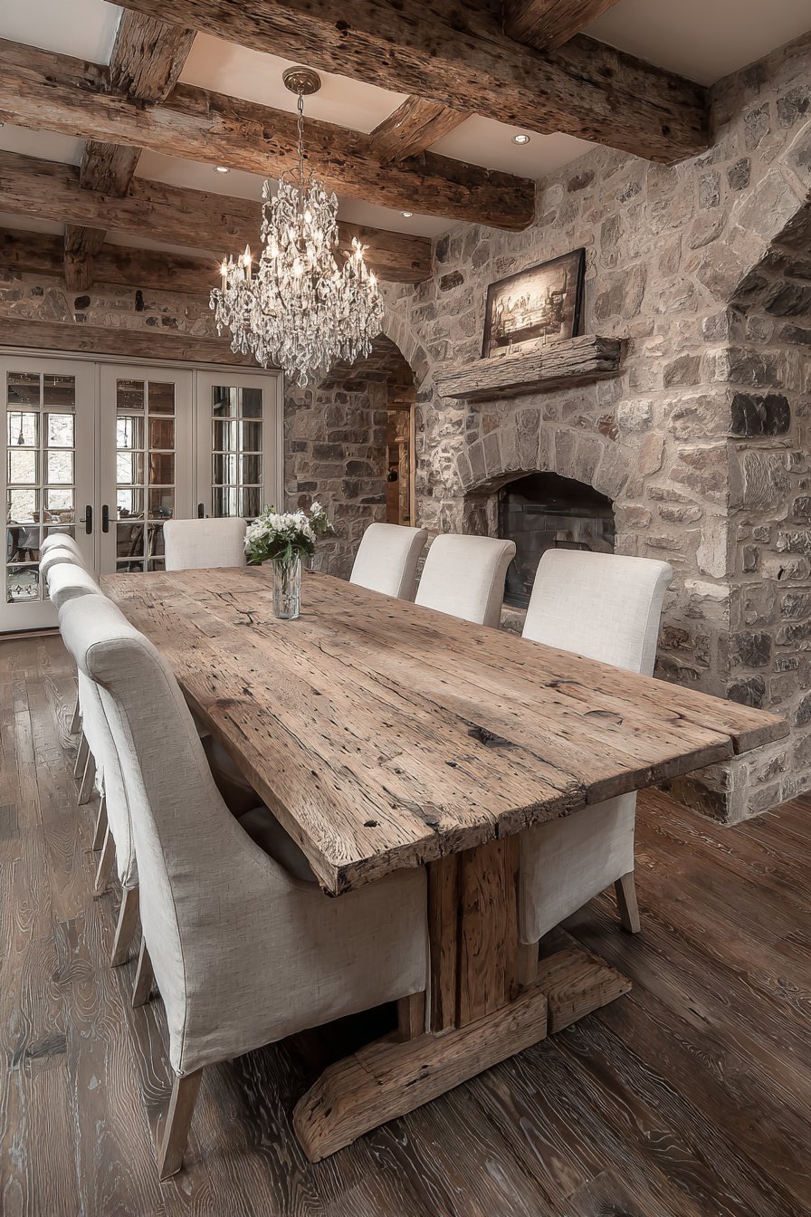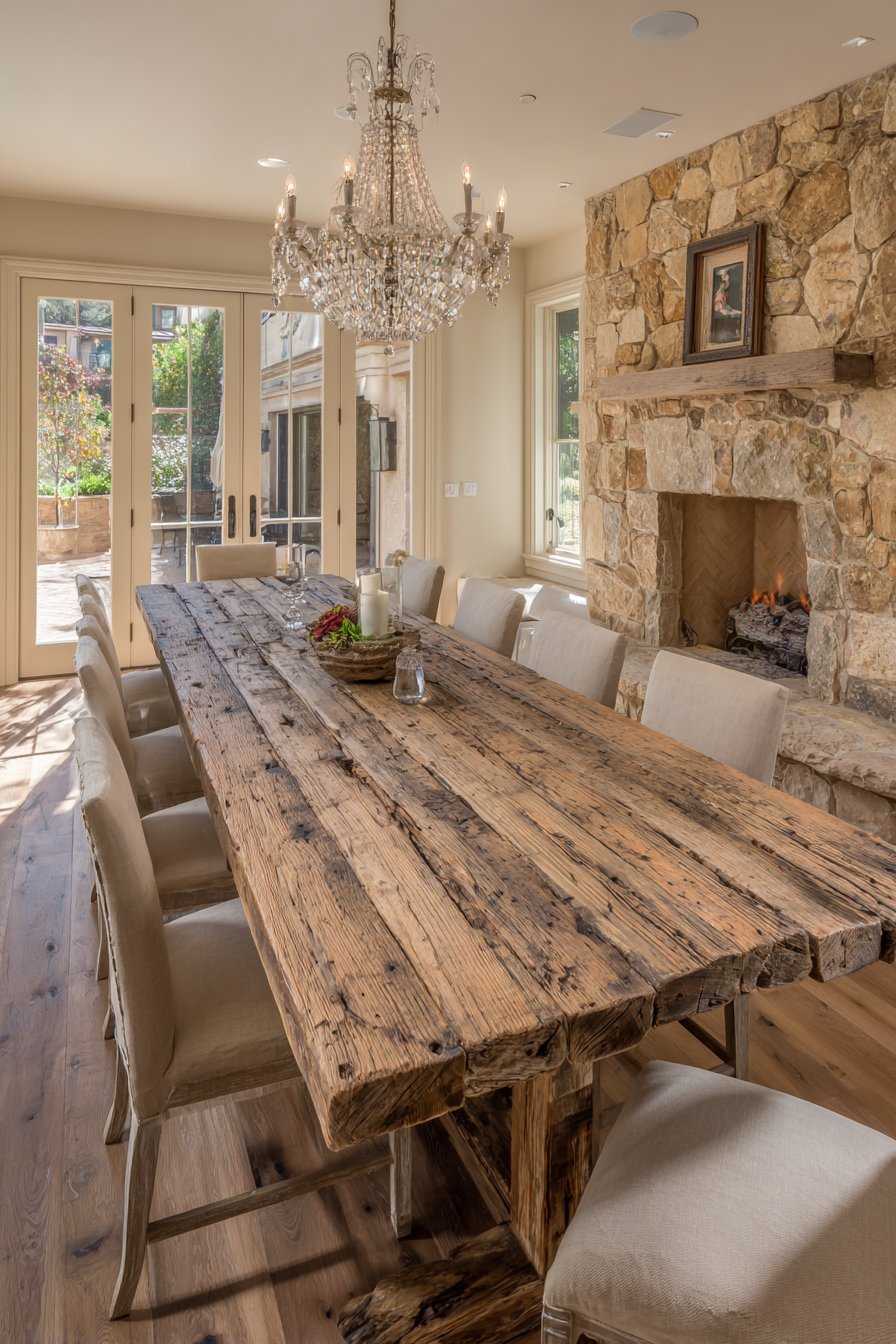 The reclaimed barn wood celebrates authentic history and craftsmanship. Cross-back chairs bridge rustic and refined design approaches seamlessly. The crystal chandelier provides surprising glamour against rough wood and stone. The exposed stone fireplace adds architectural drama and natural texture.