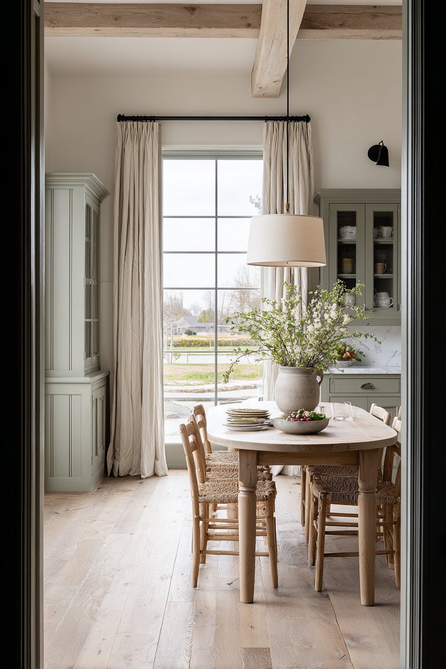 The soft grey-blue finish on the antique table adds contemporary relevance. This updated color maintains the furniture’s character while feeling current. The cane-back chairs offer visual lightness that prevents heaviness. Linen cushions add comfort without concealing the beautiful chair backs.