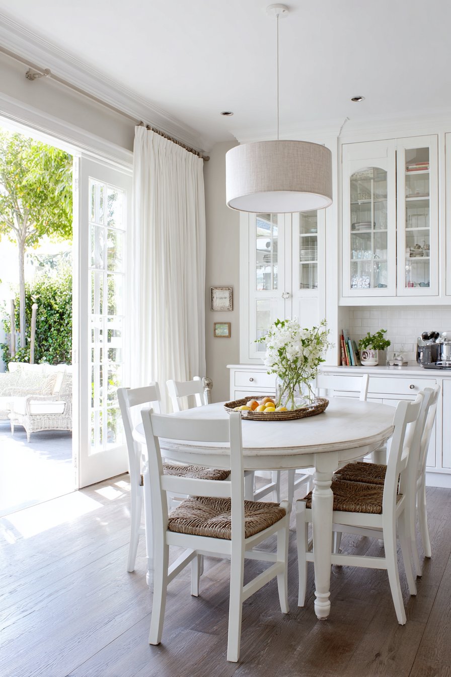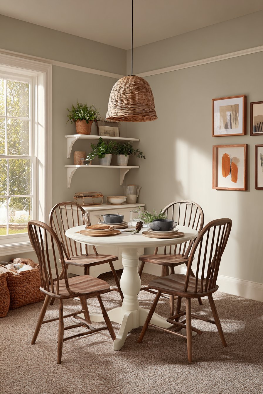 A round pedestal table in painted white finish maximizes limited square footage. Four Windsor-style wooden chairs provide comfortable seating without visual bulk. This arrangement proves that small spaces can accommodate proper dining areas. The white finish reflects light, making the compact room feel more spacious.