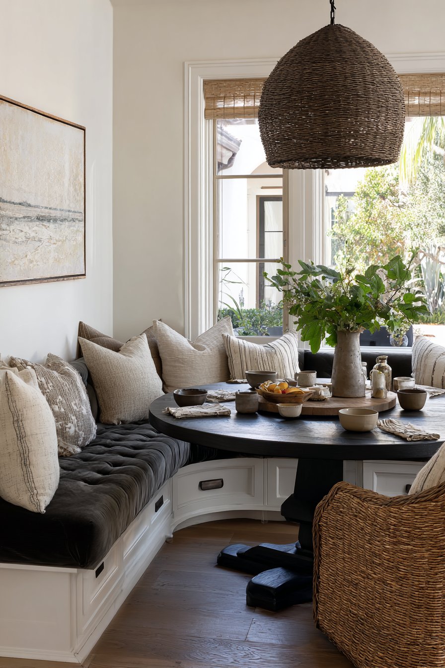 Simple stoneware dishes and linen napkins dress the table with understated elegance. Throw pillows in varied textures and muted tones enhance the seating comfort. Each pillow adds another layer of coziness to the built-in bench. The combination of soft fabrics invites guests to settle in for extended meals.