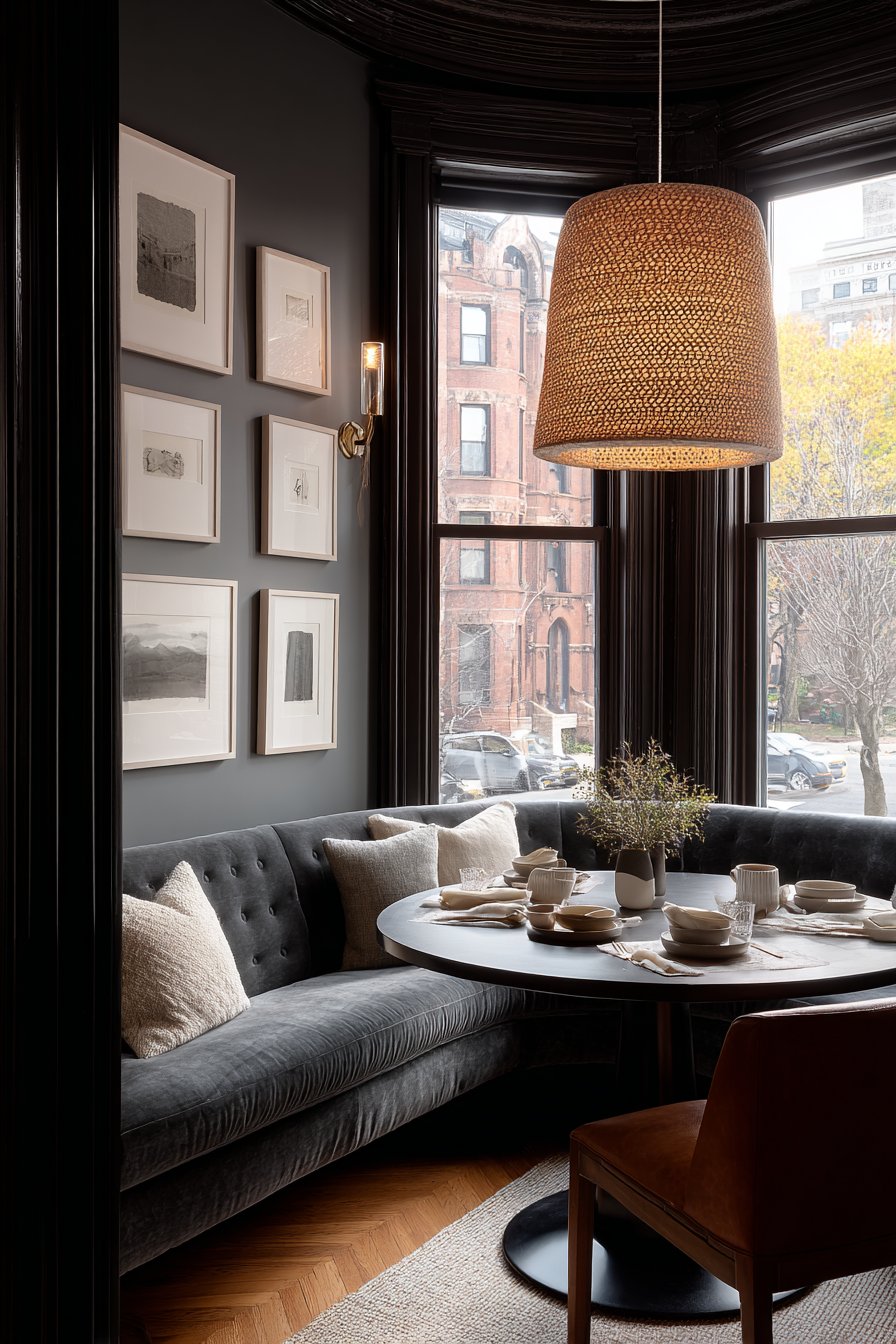 Built-in corner banquette seating upholstered in charcoal velvet creates intimate comfort. Button tufting details add sophisticated texture to the curved bench. This seating wraps around a round pedestal table in dark walnut finish. The arrangement maximizes space while encouraging conversation among diners.