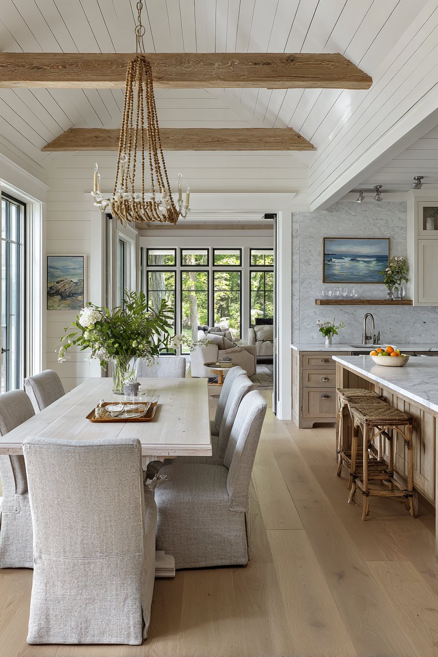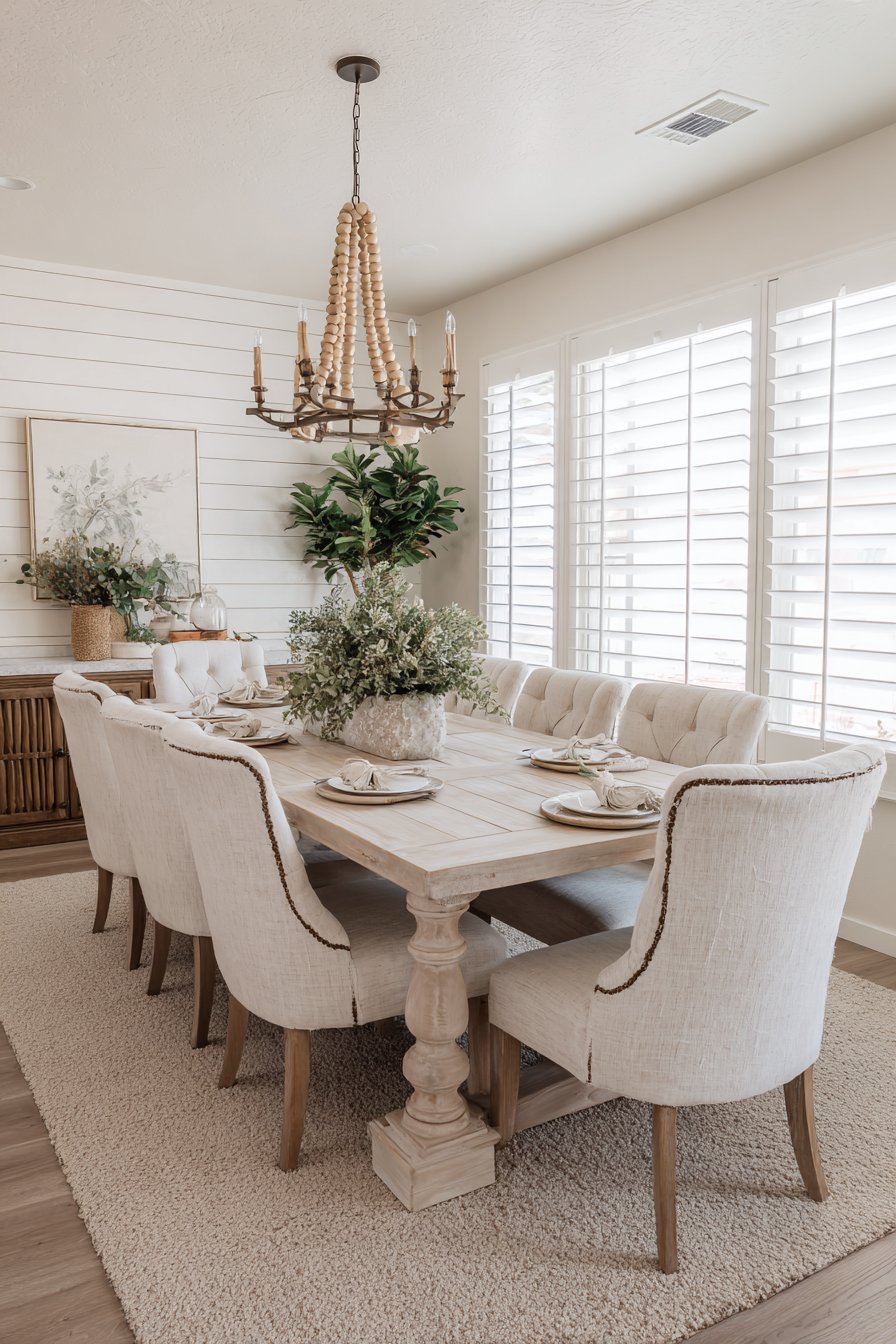 A rectangular dining table with a whitewashed finish and chunky turned legs anchors the space. Upholstered dining chairs in varied neutral fabrics, including linen, cotton, and chenille provide seating. A linear chandelier with wooden beads and metal frame hangs above. Shiplap accent wall painted in warm white provides textural interest.