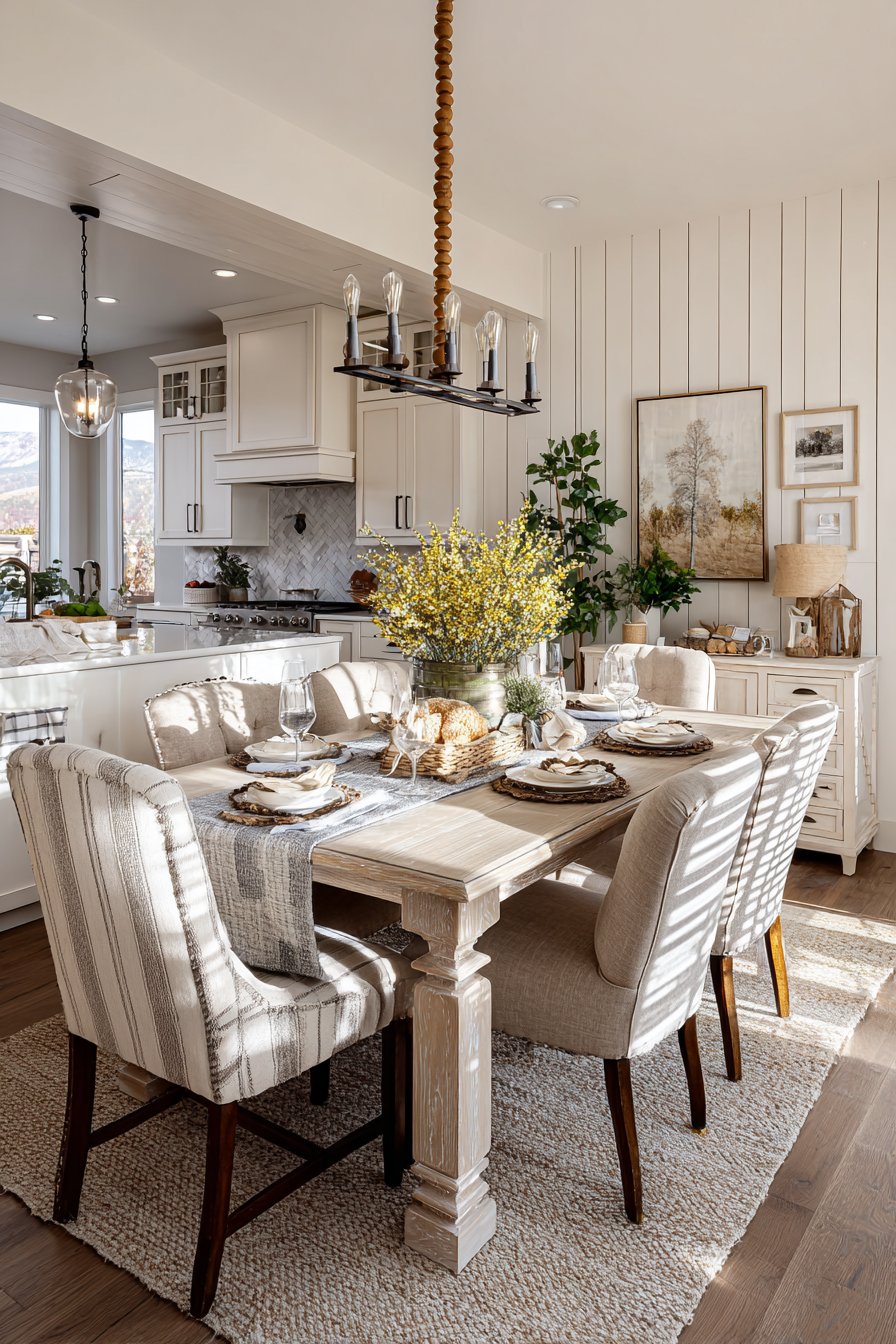 The whitewashed table finish lightens traditional farmhouse styling for contemporary appeal. Chunky turned legs maintain connection to traditional furniture forms. Varied neutral upholstery fabrics add subtle interest through texture differences. The wooden bead chandelier introduces an organic element overhead.