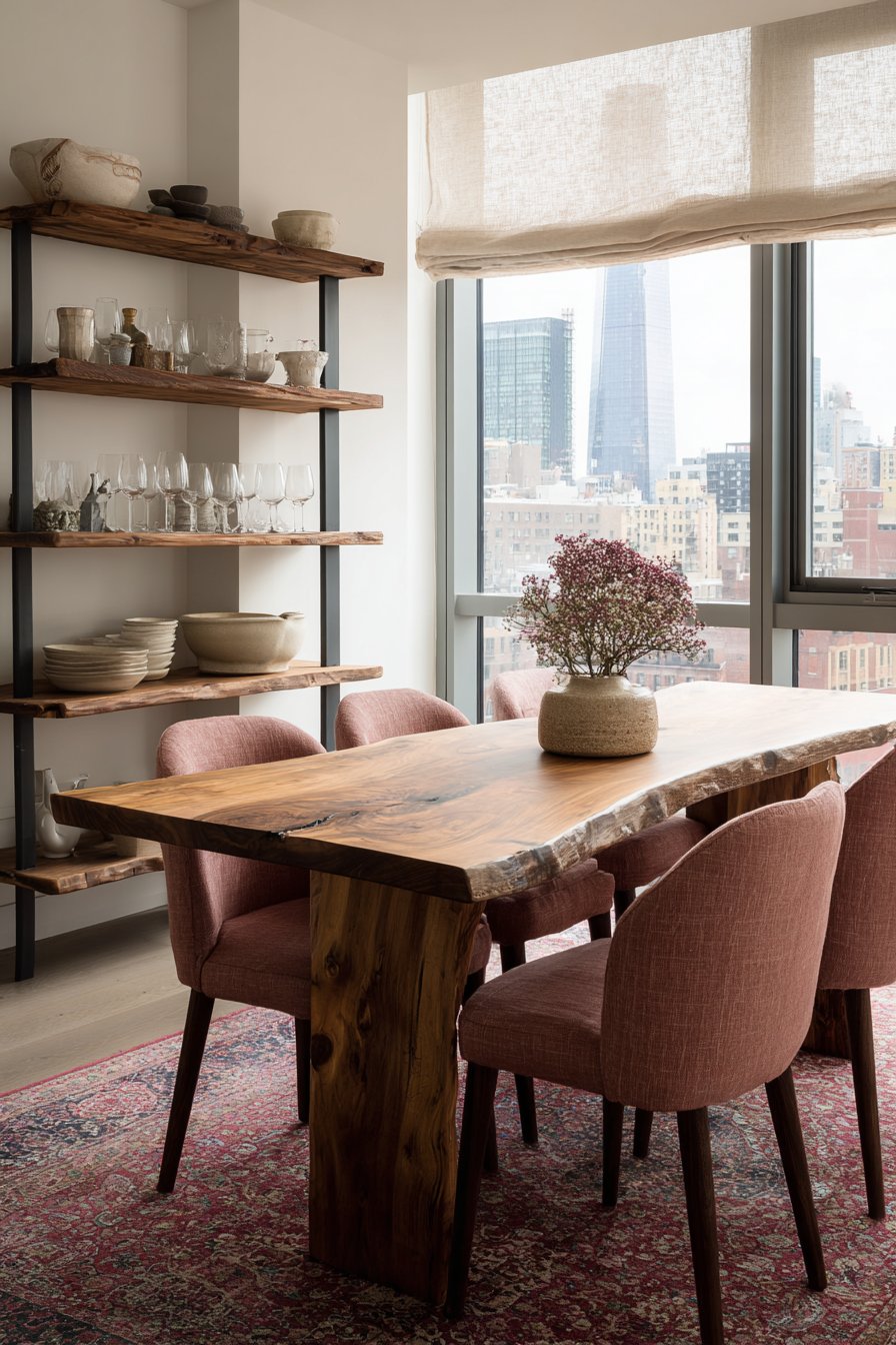 Upholstered dining chairs in warm terracotta linen surround the unique table. The earthy color palette creates immediate warmth and visual comfort. A vintage Persian rug in faded reds and blues grounds the entire composition. Open shelving displays collected ceramics and glassware with casual arrangement rather than rigid styling.