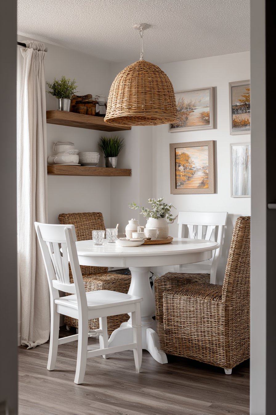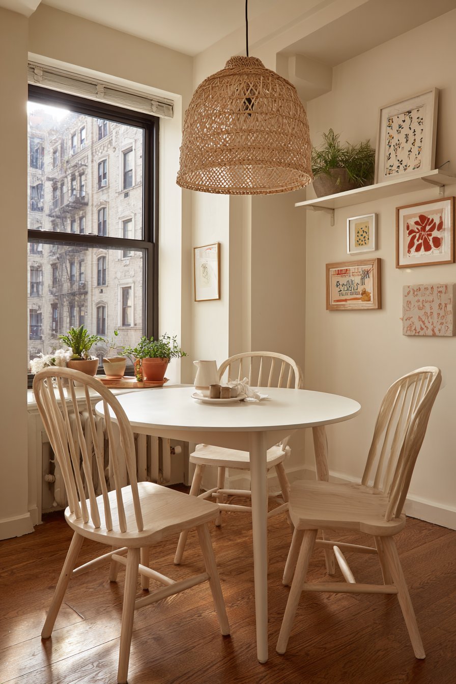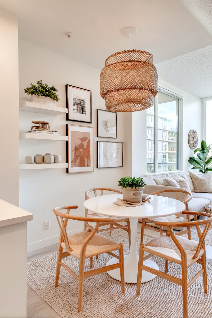The white table and light wood chairs maintain an airy, open feeling. Floating shelves eliminate bulky storage furniture that would crowd the room. The rattan pendant provides soft, diffused lighting perfect for intimate dining. Small spaces benefit from vertical storage and light-reflecting surfaces.