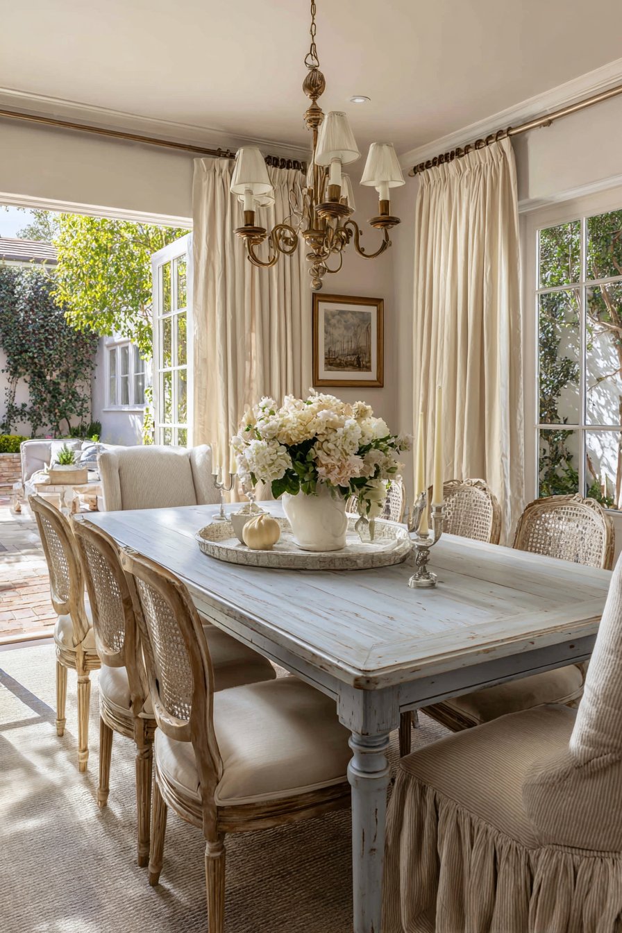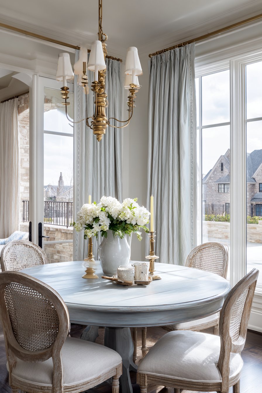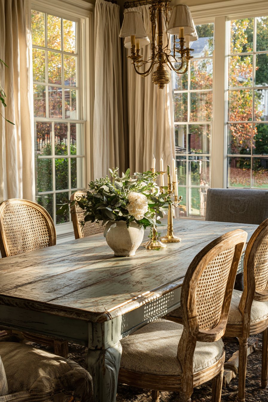 An antique French provincial dining table refinished in soft grey-blue exudes timeless charm. Cane-back chairs with neutral linen seat cushions surround the elegant table. This combination balances ornate detailing with comfortable, modern practicality. The vintage brass chandelier with fabric shades provides warm ambient lighting overhead.