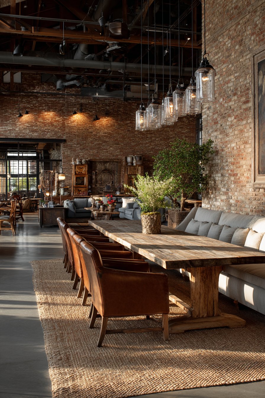 The trestle table construction allows unobstructed seating along the sides. Visible joinery celebrates craftsmanship rather than concealing construction methods. Mixed materials prevent the space from feeling too themed or singular. The exposed brick provides a perfect backdrop for the layered furnishings.