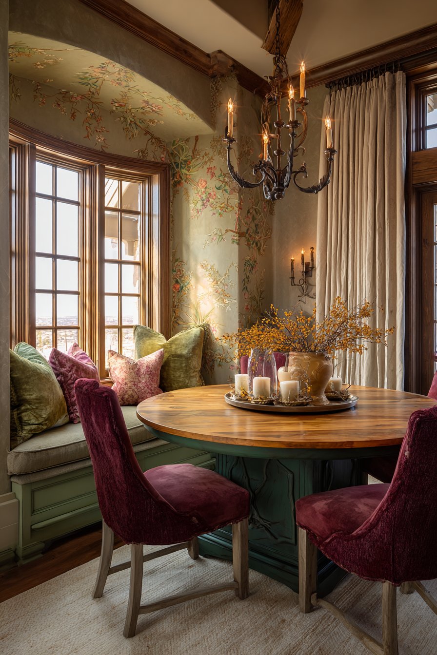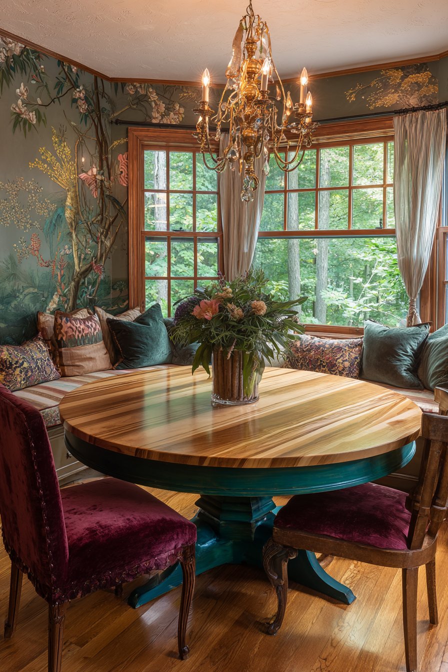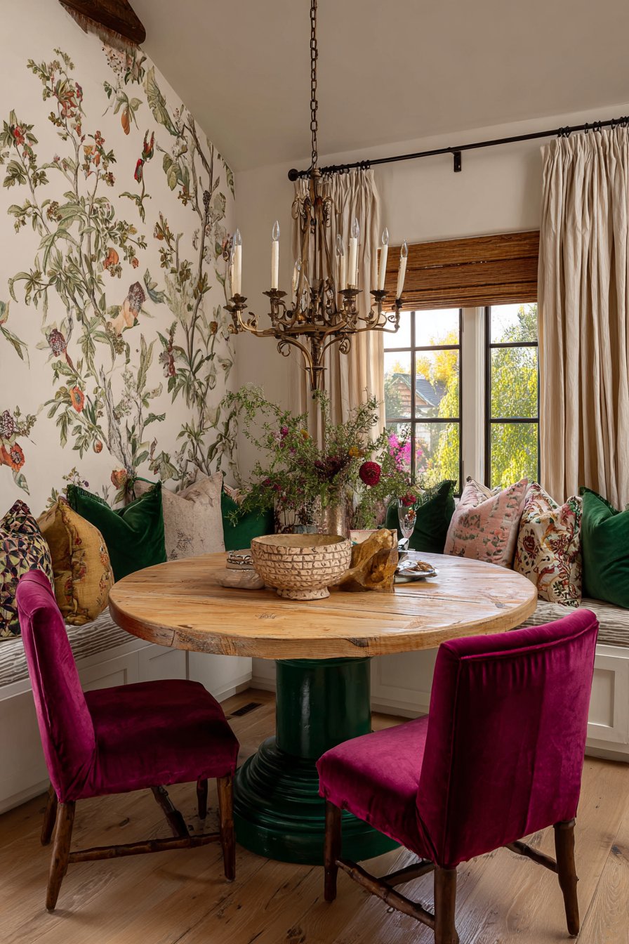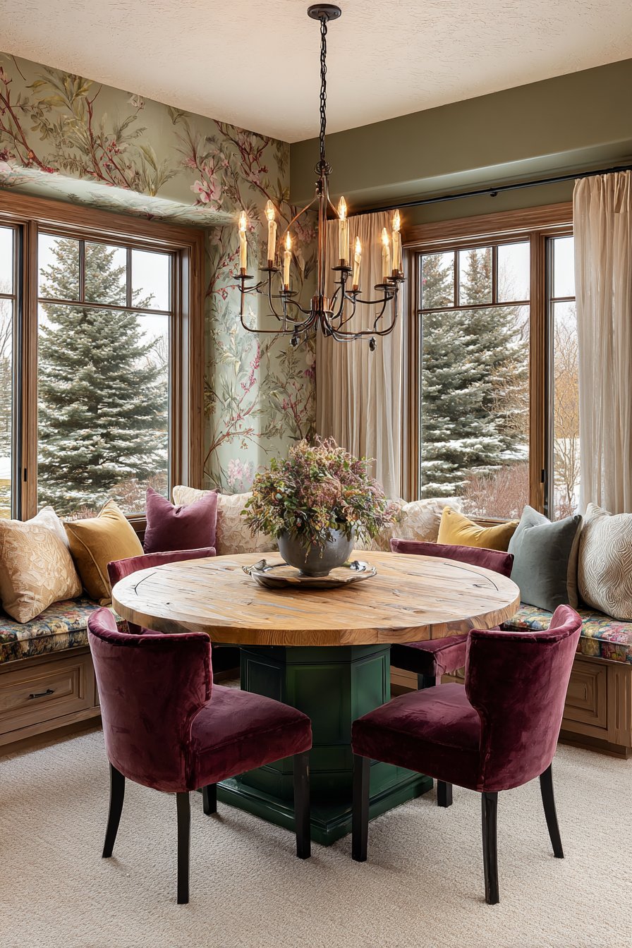 The circular table shape encourages conversation and equal participation. Deep jewel tones add richness appropriate for dining room environments. The window seat extends usable space while adding architectural interest. Botanical wallpaper connects the interior to natural garden views outside.