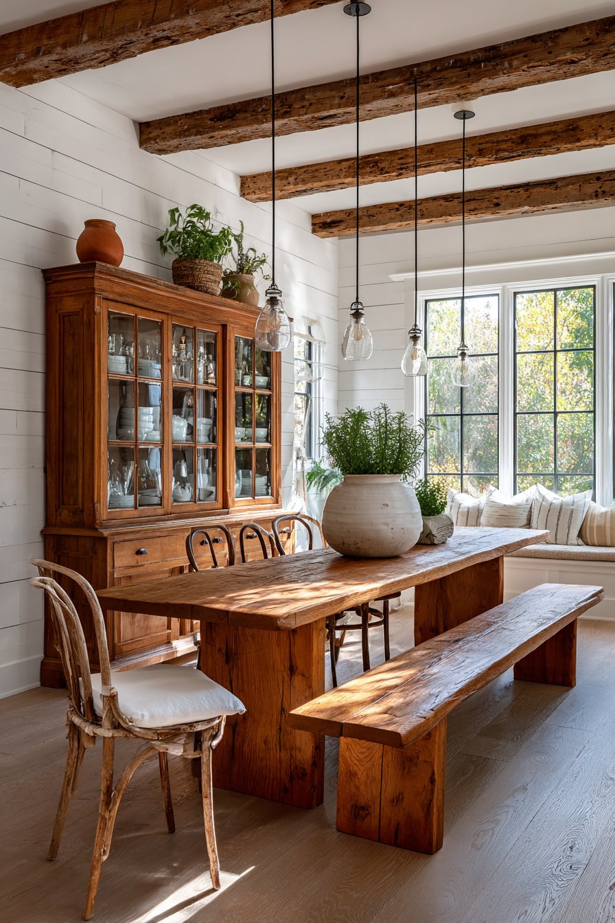 Natural daylight illuminates the practical, lived-in arrangement throughout the day. The bench seating accommodates more people than individual chairs would allow. Mismatched chairs tell a story of pieces collected over time. The exposed wooden beams add architectural character and visual warmth.