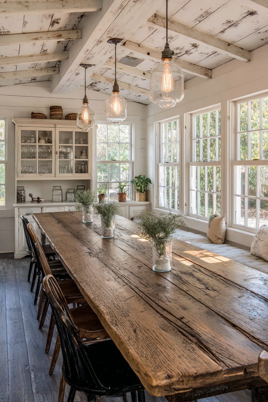 A long wooden harvest table with bench seating on one side anchors the space. Mismatched vintage chairs line the opposite side with collected charm. Whitewashed shiplap walls create a bright, clean backdrop for the gathering area. Mason jar pendant lights with Edison bulbs hang from exposed wooden beams overhead.