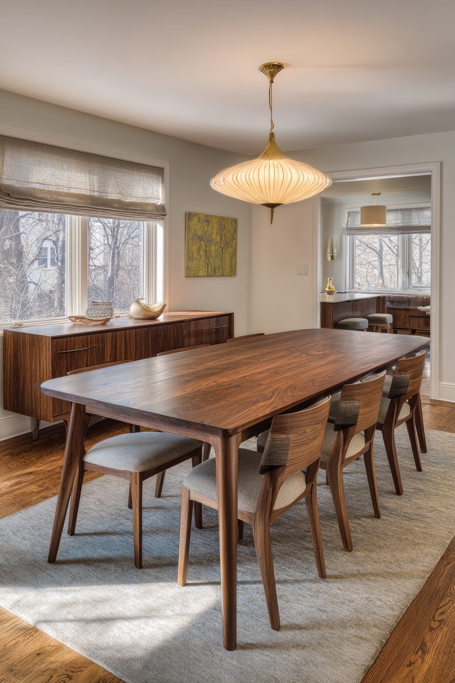 A mid-century modern walnut dining table features tapered legs and rounded edges. The warm wood tone creates inviting contrast against neutral walls. Iconic molded plastic chairs in warm neutral tones surround the sleek table. A sculptural pendant light in brass and white glass provides focused illumination.