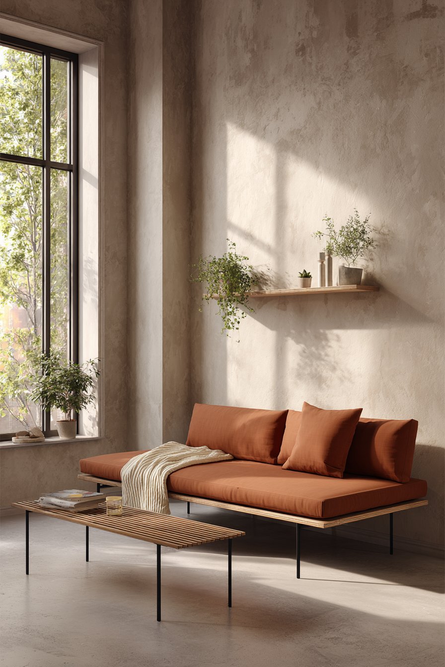 Soft afternoon light creates gentle shadows that emphasize the room’s clean geometry. The terracotta sofa becomes a warm focal point within the neutral space. The combination of warm and cool tones creates balanced visual temperature. This careful calibration prevents the room from feeling either cold or overwhelming.