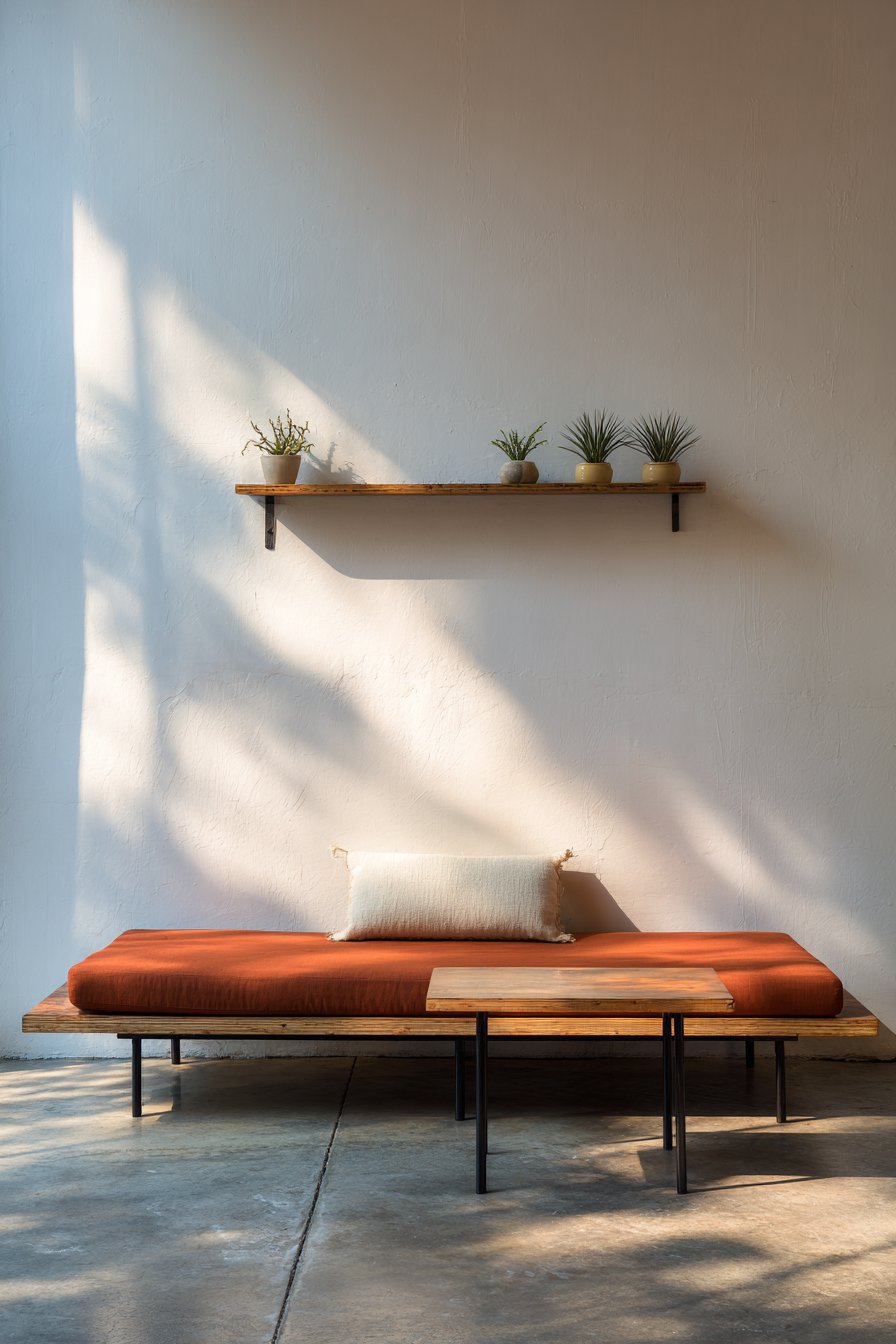 Inviting serenity emerges from this design’s peaceful composition. The daybed encourages afternoon napping and relaxed reading. The dried grasses bring nature indoors without demanding care. The concrete floor’s cool surface balances the warm textiles. This combination creates spaces for genuine rest and restoration.