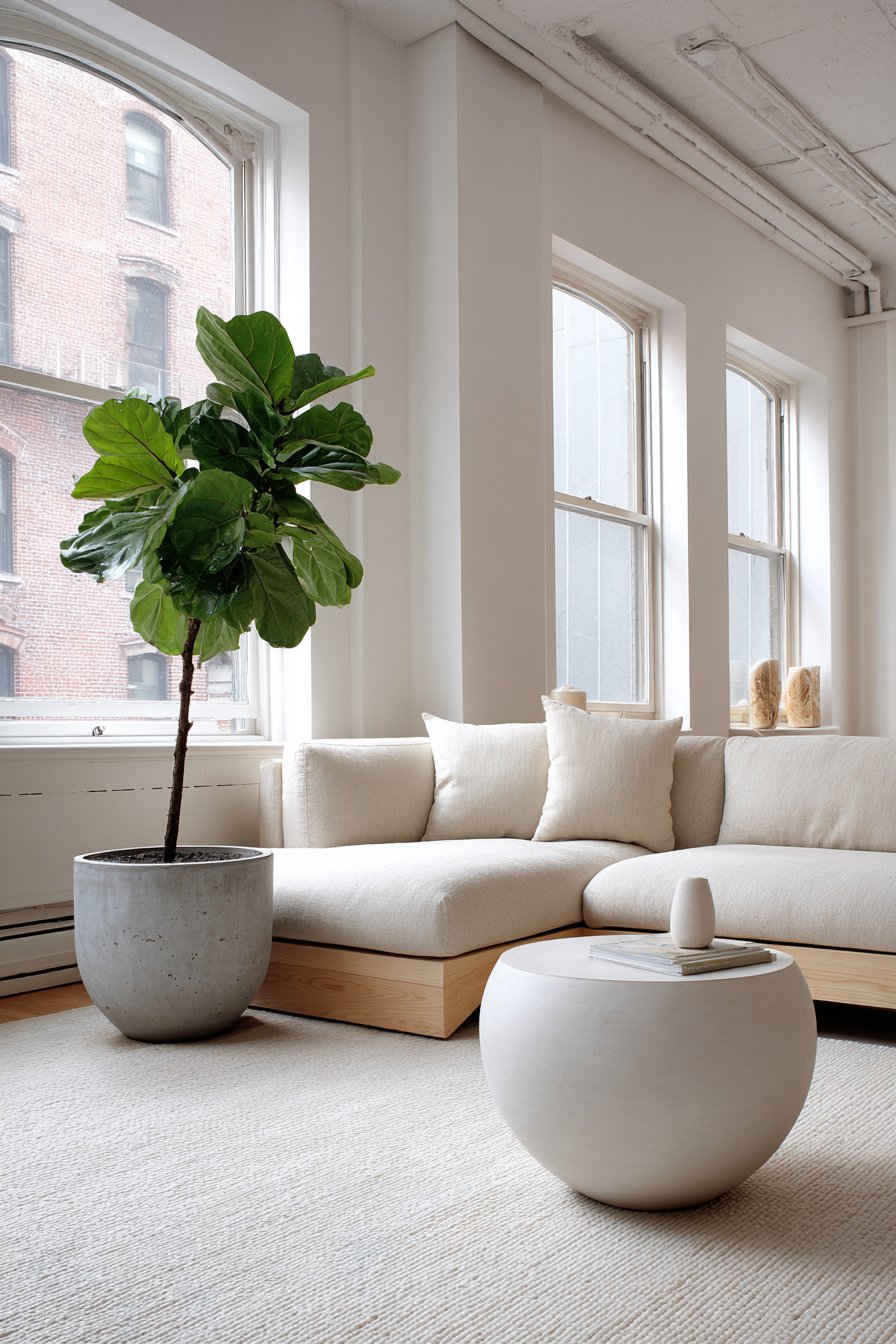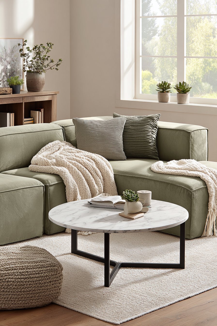 A round marble coffee table with black metal base centers the seating area elegantly. The marble’s natural veining provides organic interest that never grows tiresome. A simple wool area rug in natural ivory grounds the furniture grouping. Three small potted succulents in ceramic planters line the windowsill, bringing life without maintenance demands.