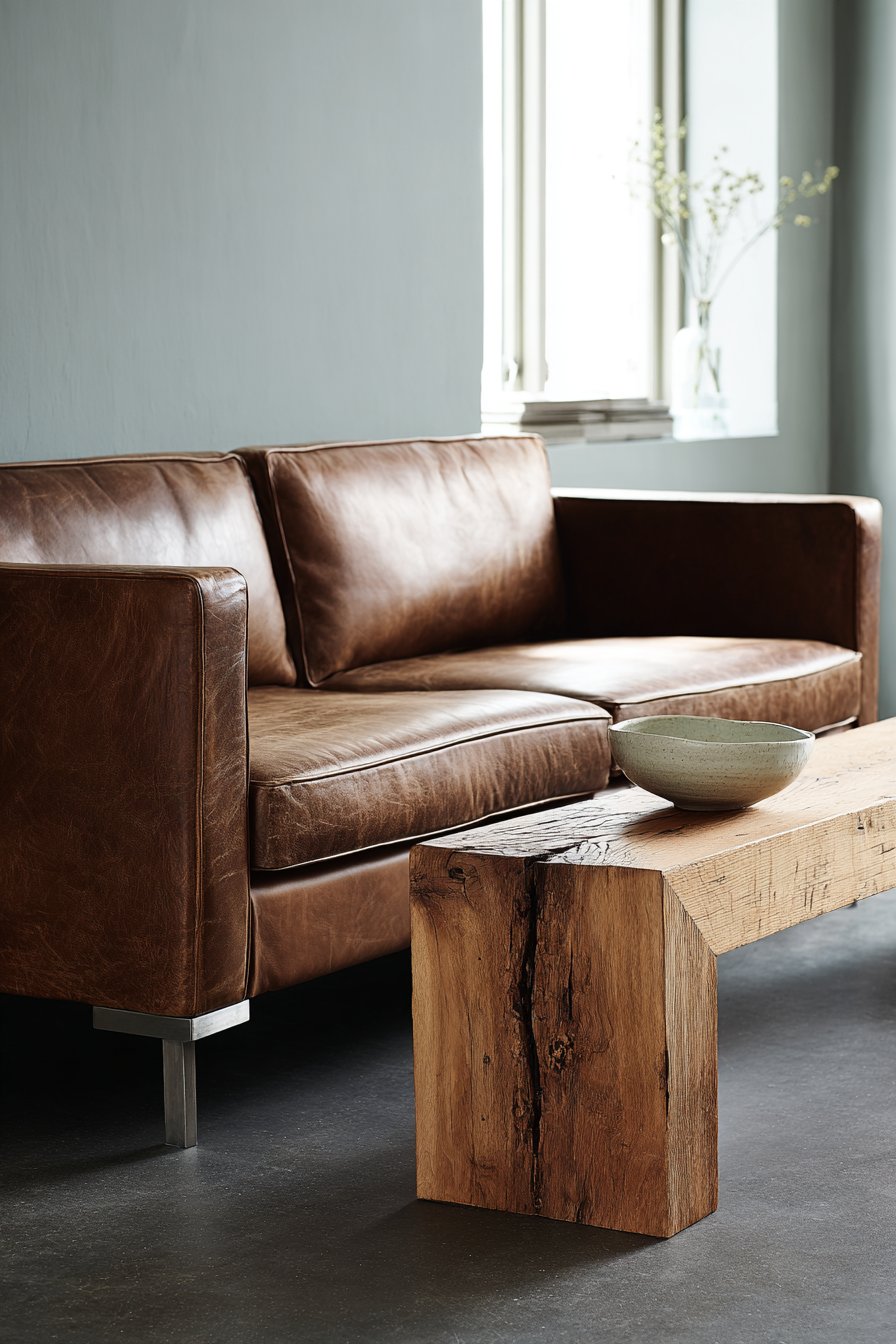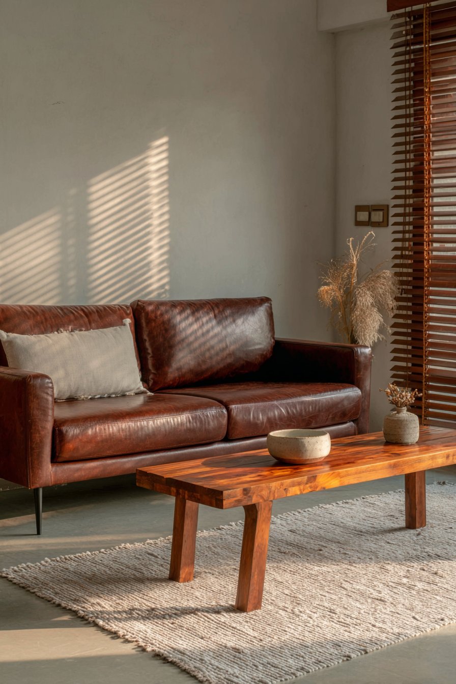 A streamlined two-seater sofa in rich chocolate brown leather showcases natural aging characteristics. The leather’s authentic patina tells stories of use and time. Simple metal legs maintain contemporary appeal beneath classic upholstery. A minimal wooden bench made from solid teak serves dual purpose as coffee table.