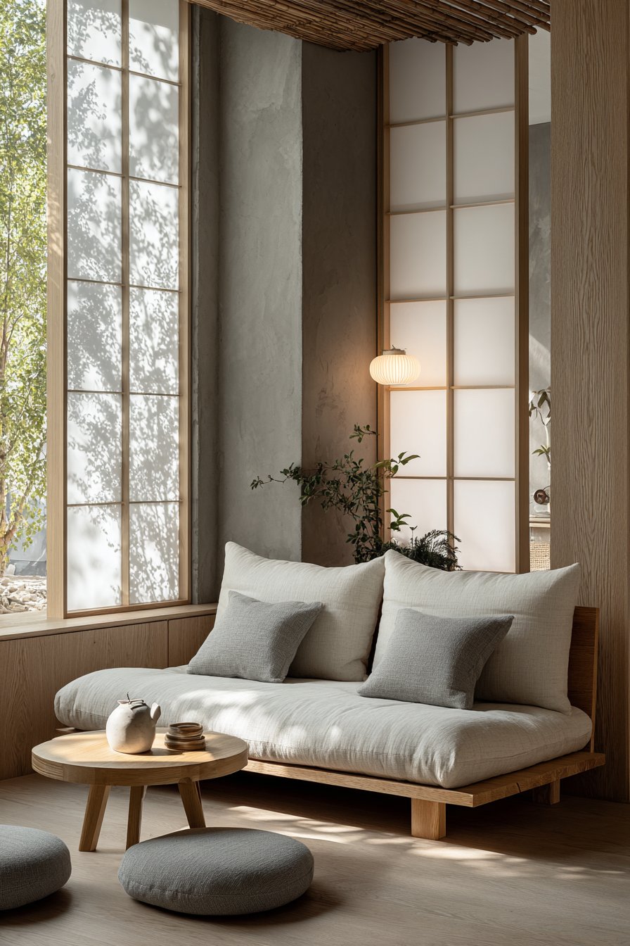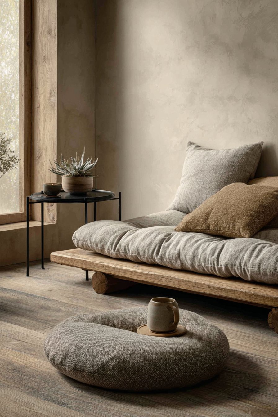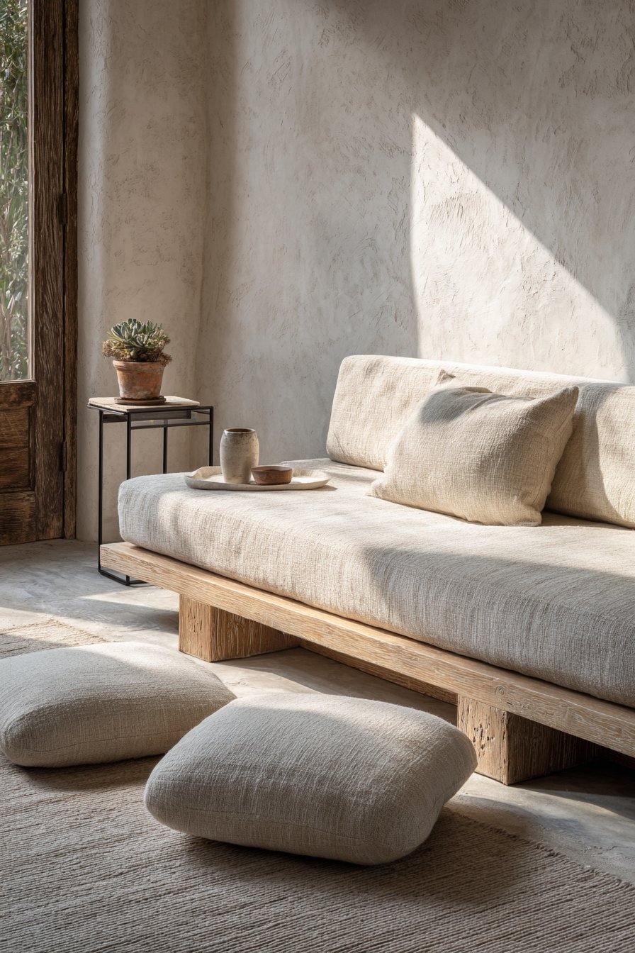 A Japanese-inspired low platform sofa with natural linen upholstery embodies zen-like simplicity. The visible wooden frame in light oak showcases craftsmanship and honest construction. Two square floor cushions in muted clay tones provide flexible additional seating. This approach to furniture emphasizes connection with the ground and mindful living.