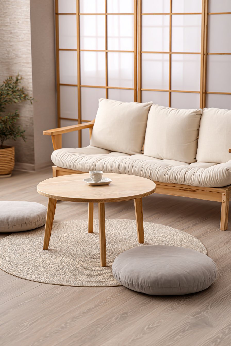 A simple round coffee table in natural bamboo sits on tatami-style matting. The bamboo’s organic rings and natural color add subtle interest. Shoji screen-inspired window panels filter gentle daylight throughout the space. The diffused light creates even illumination without harsh shadows.